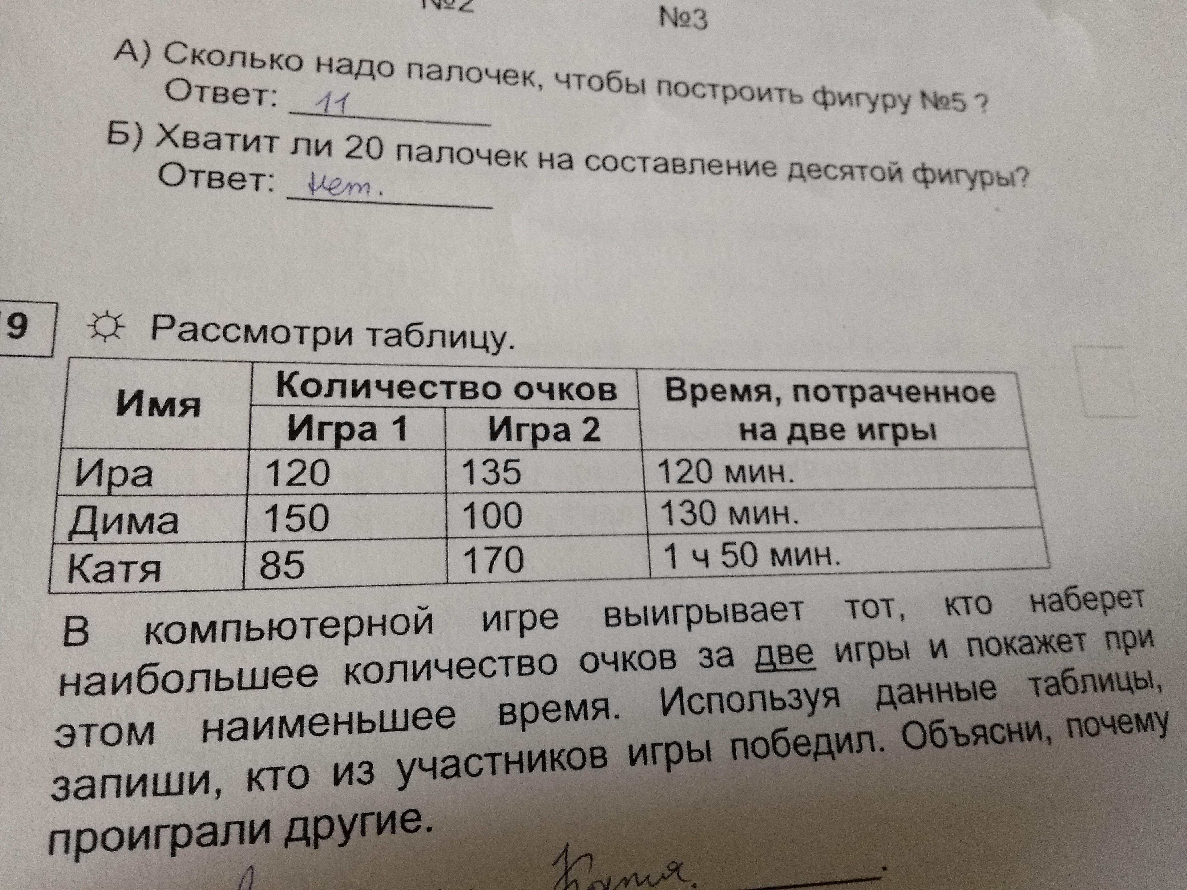В компьютерной игре выигрывает тот,кто наберёт наибольшее количество очков за две игры и покажет при этом наименьшее время.