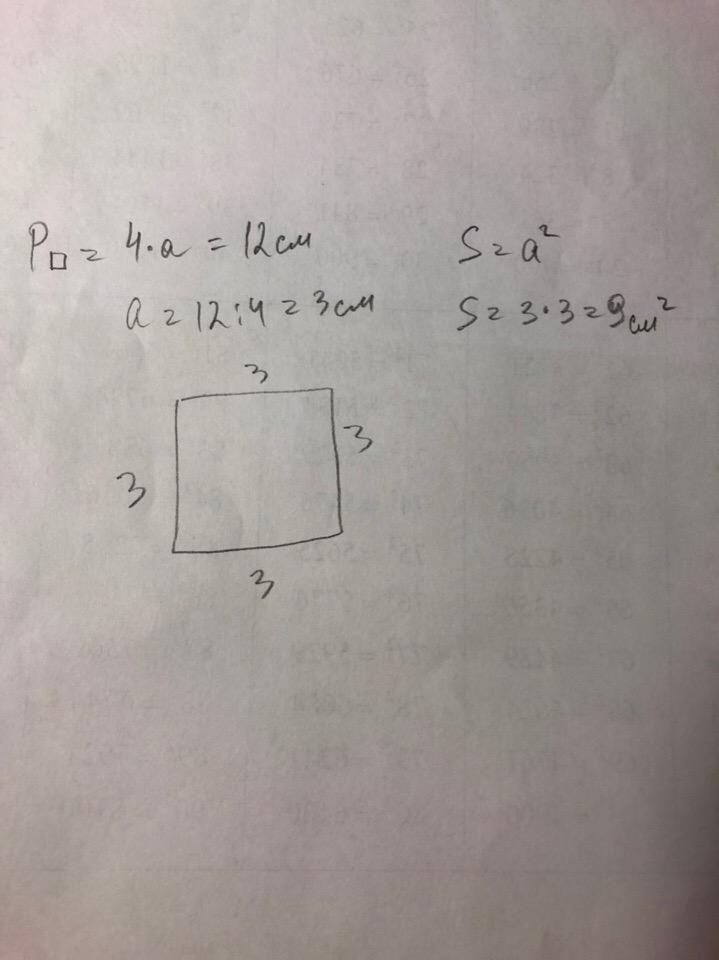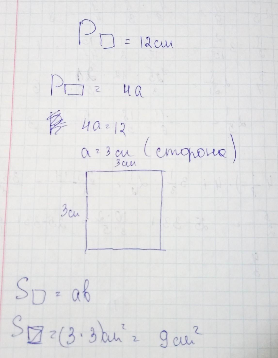Р=а4 (периметр =а умножить на 4),а найти сторону а,если периметр равен 12.то обязательно правило такое а=Р:4 и теперь вставляем числа,а=12:4,значит а=3,и потом по формуле находим площадь квадрата---Главное знать формулы