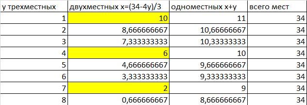 В гостинице имеются одноместные, двухместные и трёхместные номера. Всего номеров 18, а всего мест во всех номерах 34. Одноместных номеров столько, сколько двухместных и трёхместных вместе. Сколько в гостинице двухместных номеров?