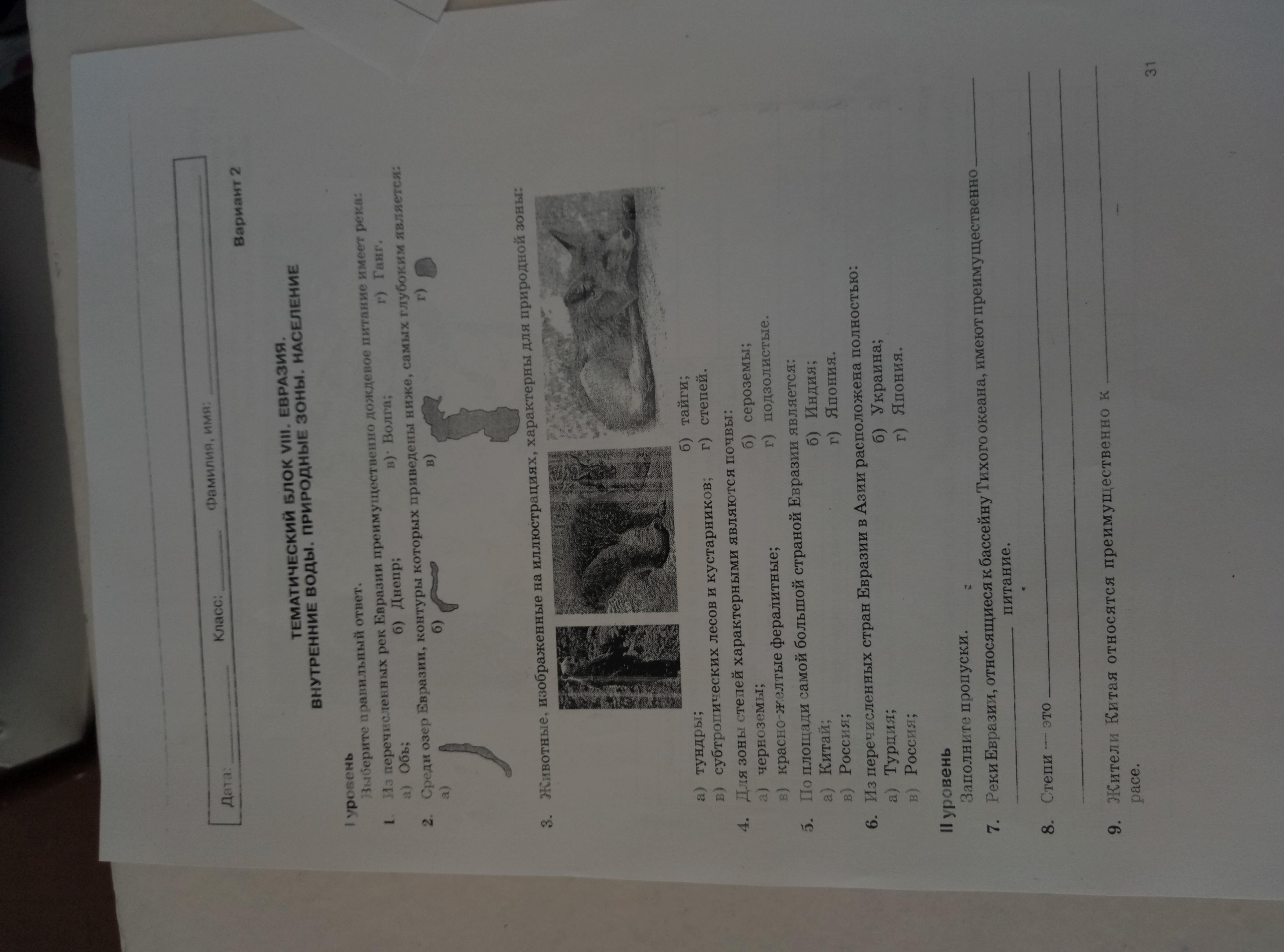 1.Ганг. 2.А. Это Байкал. 3. Тайга. 4. Чернозёмы. 5.Россия. 6.Япония. 7.Дождевое питание. 8. Степь - это природная зона, в которой преобладают травянистые растения, а древесные практически отсутствуют. 9. Монголоидная раса.