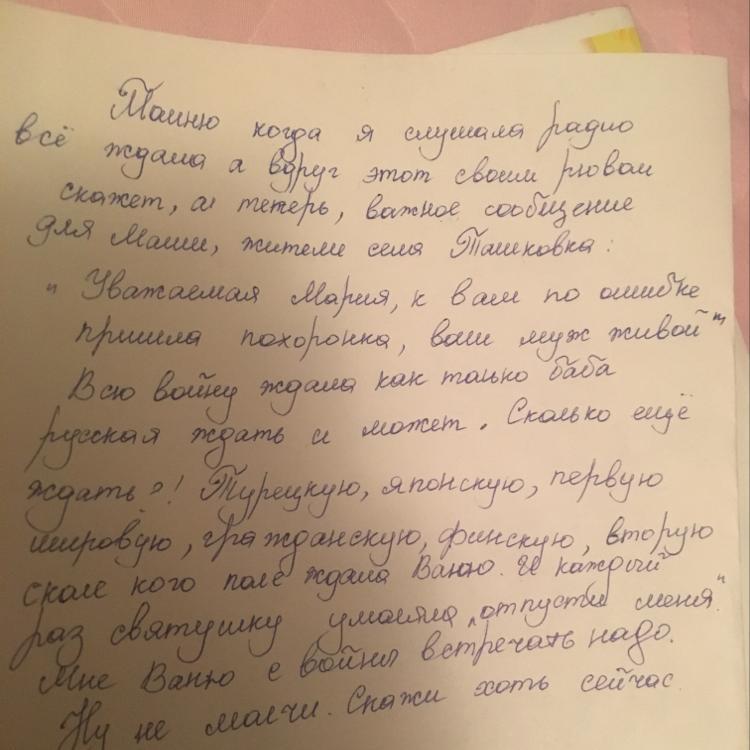 есімде, радио тыңдаған кезде барлығы күтті, ал кенеттен бұл өзінің қызғанышымен айтса, енді ташковка ауылының Маша тұрғындары үшін маңызды хабарлама: "құрметті мария, сізге қателесіп сіздің күйеуіңіз тірі жерленеді. соғыс бойы орыс әжесі күтіп, мүмкін. тағы қанша күту керек!? түрік, жапон, бірінші әлемдік ,азаматтық, фин , екінші, Ваня қанша алаң күтіп тұрды. және әр жолы святушку умоля, оменяды босатыңыз. мен Ваняды соғыстан қарсы алу керек. ал, үнсіз емес. қазір айтыңыз.