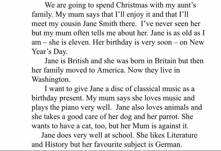 Мы собираемся провести Рождество вместе с семьёй моей тети. Мама уверяет, что мне это понравится, и что я там встречу свою кузину (двоюродную сестру) Джейн Смит. Я ее никогда не видел, но тем не менее моя мама часто рассказывает мне о ней. Джейн столько же лет, сколько и мне - одиннадцать. Ее день после рождения очень скоро - в Новый Год.