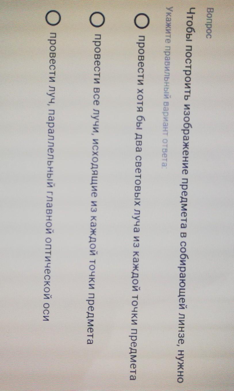 Немного некорректно составлен данный тест, который вы решаете, т.к требуется провести 2 луча чтобы построить предмет в собирающей линзе это луч параллельно проведённый оптической оси в точку фокуса и второй луч направляется из верхней точки предмета через центр оптической линзы, мне кажется ни один из этих ответов не верный, но всё же я больше склоняюсь что это ответ 3