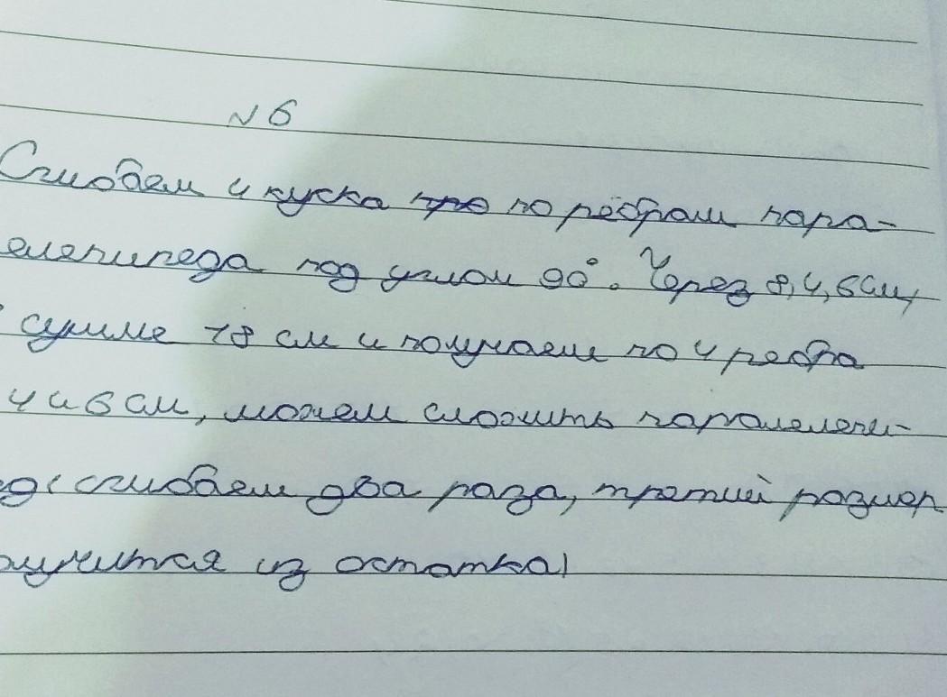 Имеются 4 куска проволоки длиной 18 см каждый. Как из них сделать каркасную модель параллепипеда с размерами 8 см, 4 см и 6 см, не разреза этих кусков? (10 баллов)