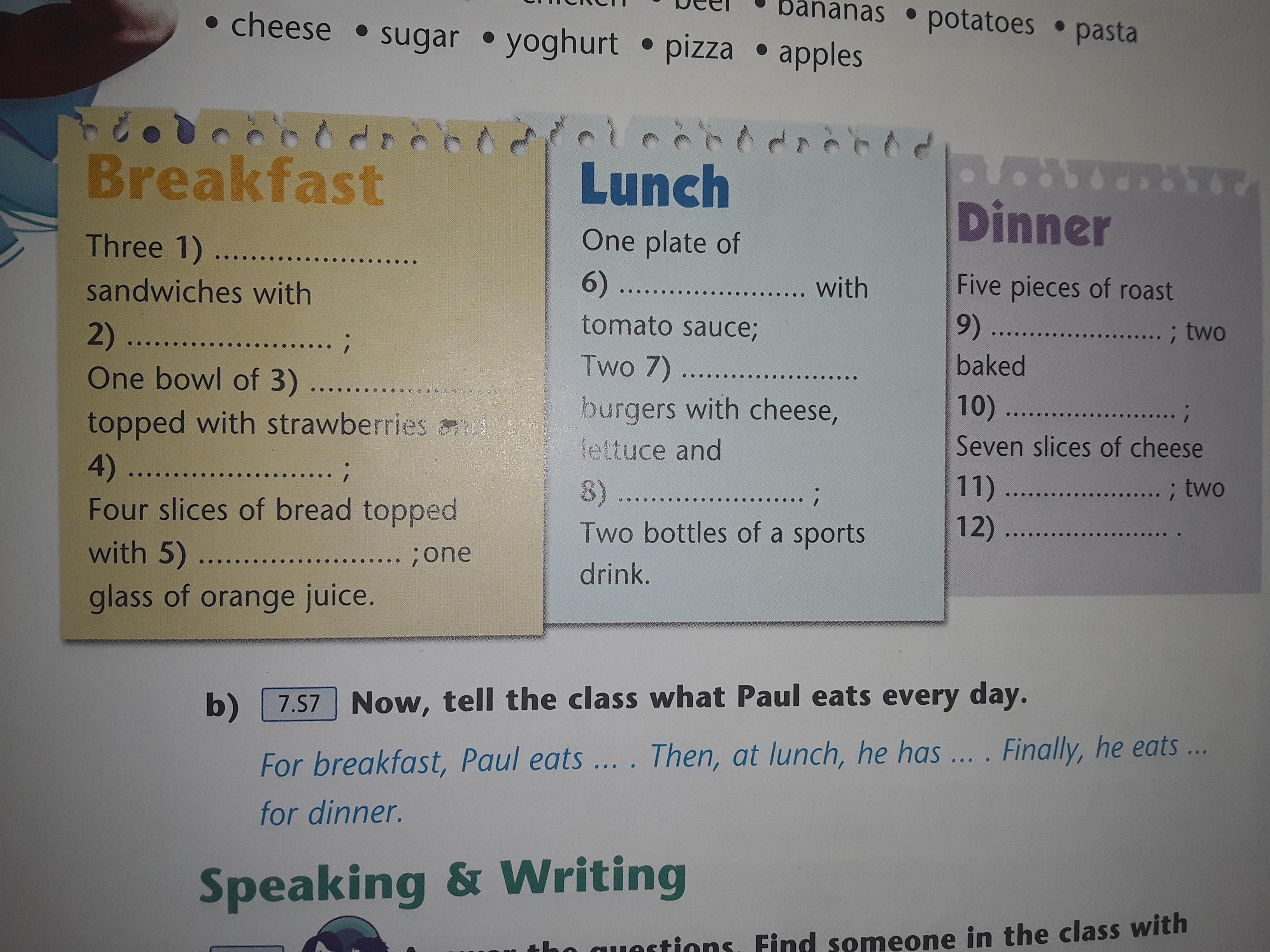 перевод: завтрак три яйца, бутерброды с сыром, одна баночка йогурта с клубникой и бананом , пять ломтиков хлеба с сахаром. Стакан апельсинового сока.обед. тарелка макарон с томатным соусом, два мясных бургера с сыром, салатом и курицей. две бутылки спортивного напитка.