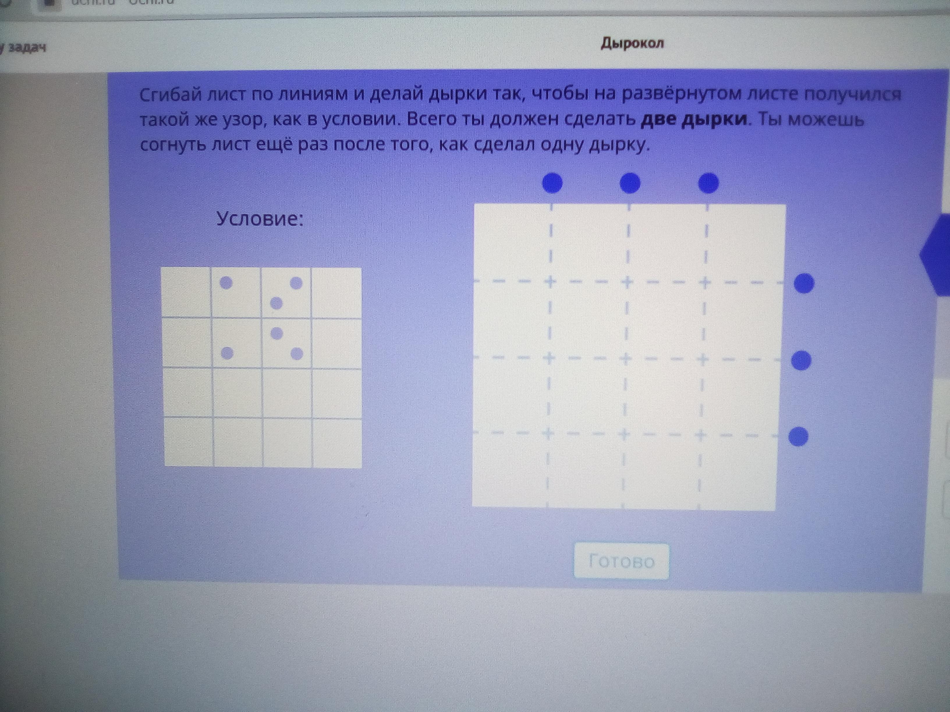 сгибай лист по линиям и делай дырки так, чтобы на развёрнутом листе получился такой же узор, как в условии. всего ты должен сделать 2 дырки. ты можешь согнуть лист ещё раз после того, как сделал одну дырку.