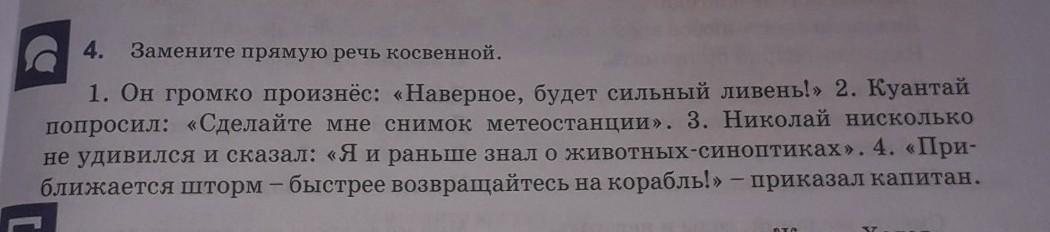 1. он громко сказал , что наверное будет сильный ливень. 2 Куантай попросил , что-бы ему седлали снимок метеостанции. 3 Николай нисколько не удивился и сказал , что и раньше знал о животных-синоптиках. 4. Капитан приказал , что-бы быстрее возращались на корабль, потому-что приближается шторм.