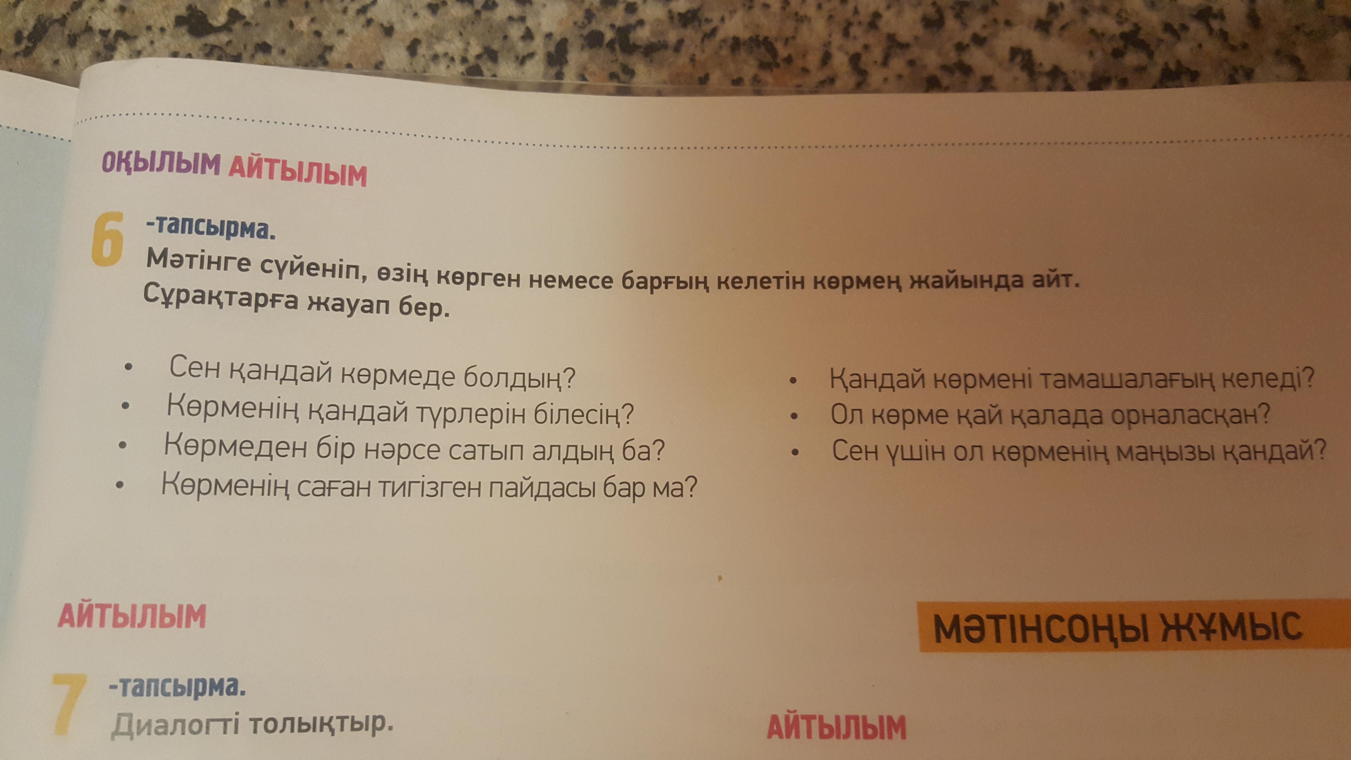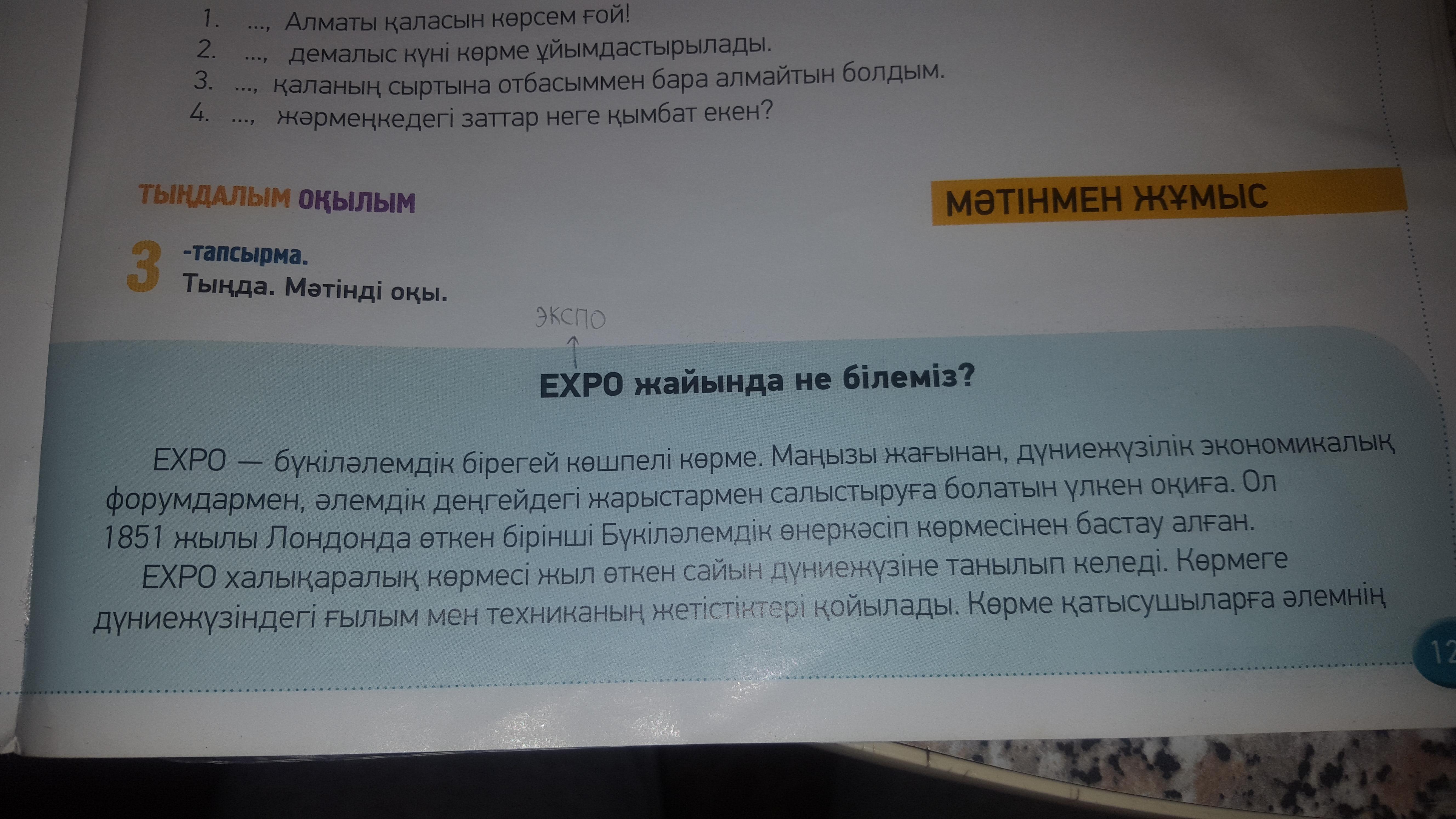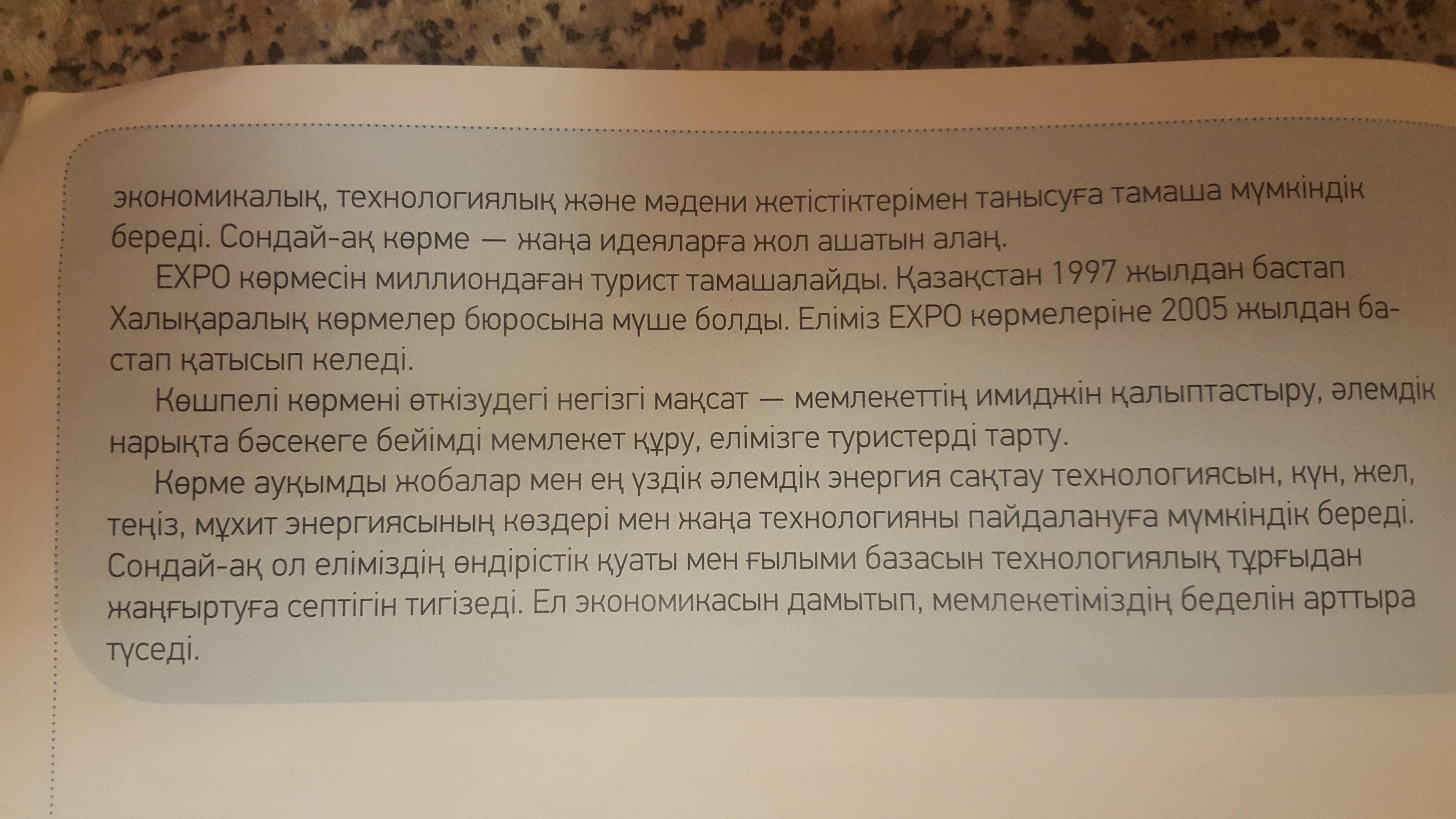 EXPO көрмесің тамашалағым келеді . Ол көрме Нұр сұлтан қаласында орналасқан .