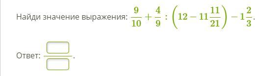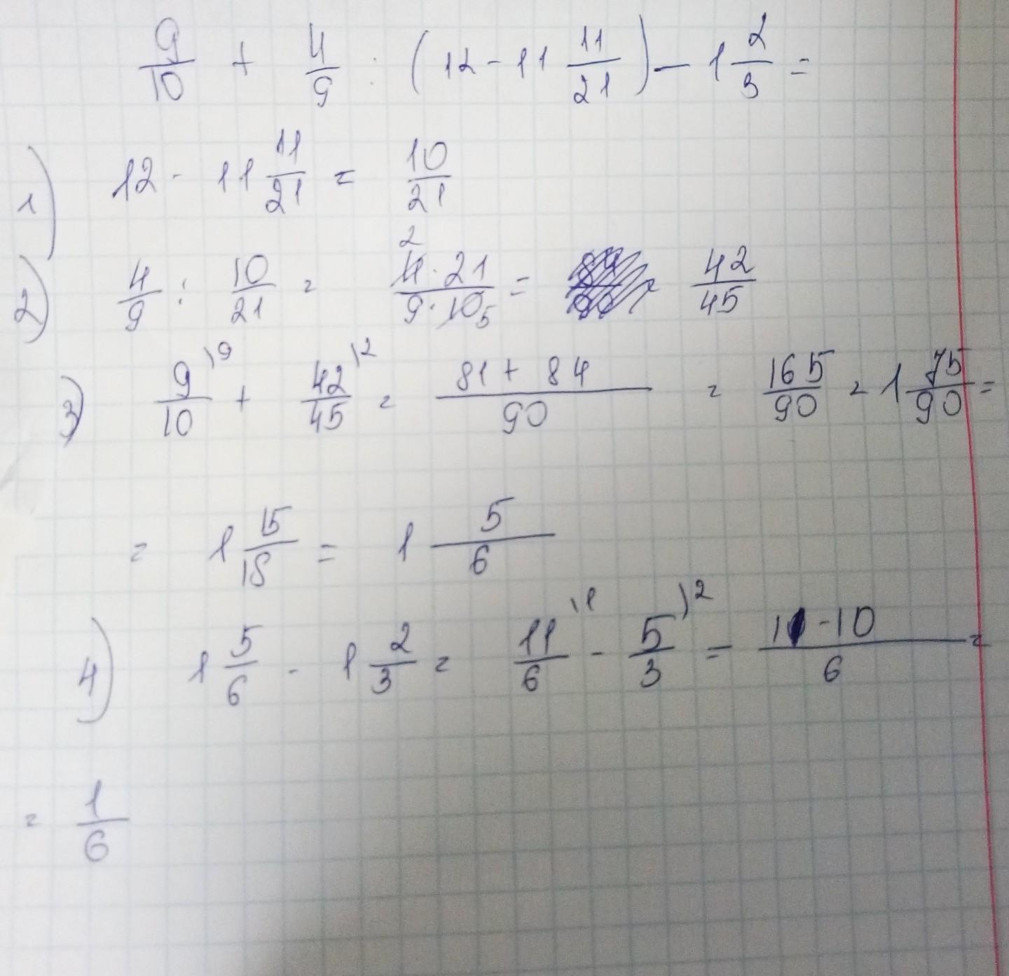 9/10 + 4/9 : (6 - 5 11/21) - 1 2/3 = 1/6