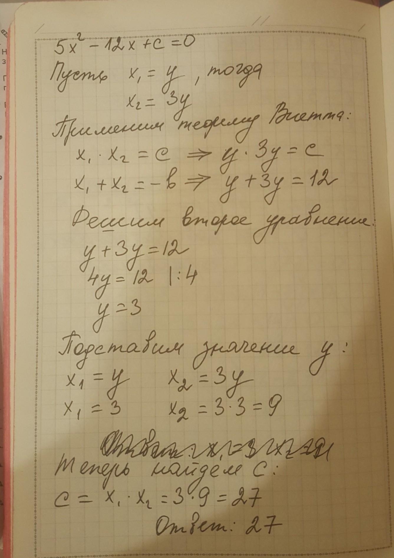 Система из двух уравнений теоремы Виета. Каждая строчка - два уравнения системы по очереди. 4а - это а+3а. поскольку по условию один корень уравнения в три раза больше другого, мы приняли один корень за а, а второй - за 3а. по теореме Виета х1 +х2 = - b, поэтому a+3a=12; 4a=12