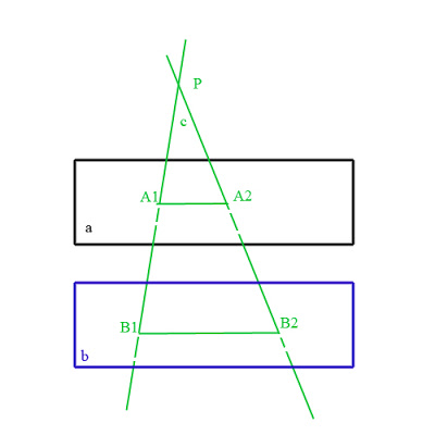 Проведем плоскость через 3 точки P, B1, B2 (назовем ее плоскость с)- эта плоскость пересекает две параллельные плоскости.