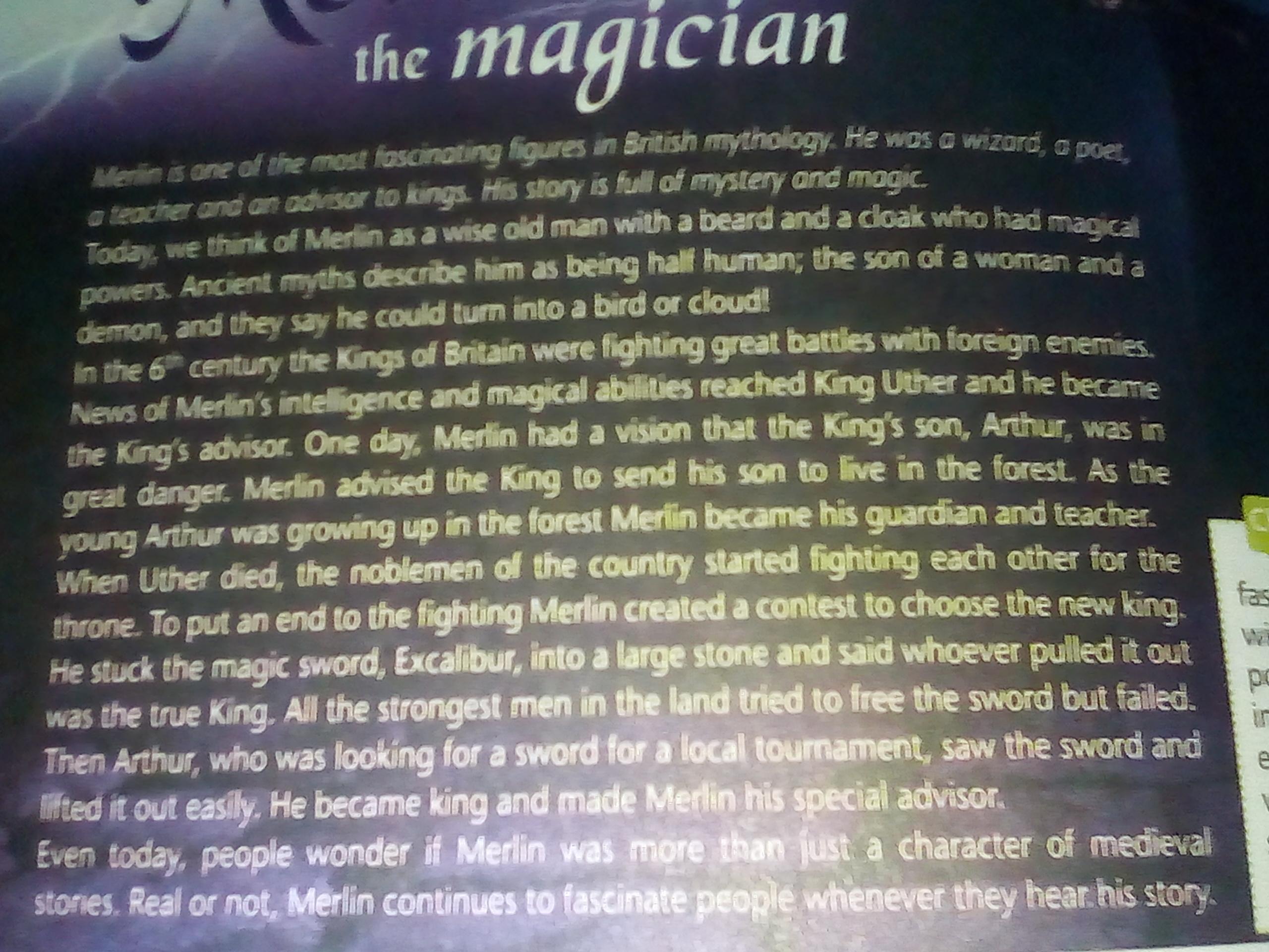 В 6 веке британские короли вели большие сражения с иностранными врагами. Весть об интеллекте и магических способностях Мерлина дошло до короля Утера, и он стал советником короля. Однажды Мерлину было видение, что сын короля, Артур, находится в большой опасности. Мерлин посоветовал королю отправить сына жить в лес. Так как юный Артур рос в лесу, Мерлин стал его опекуном и учителем. Когда умер Утер, дворяне страны начали сражаться друг с другом за трон. Чтобы положить конец боям, Мерлин объявил выборы нового короля. Он воткнул волшебный меч, Экскалибур, в большой камень и сказал, что тот, кто вытащит его, будет истинным королем. Все сильнейшие люди на земле пытались освободить меч, но потерпели неудачу. Затем Артур, который искал меч для местного турнира, увидел меч и легко поднял его. Он стал королем и сделал Мерлина своим специальным советником.