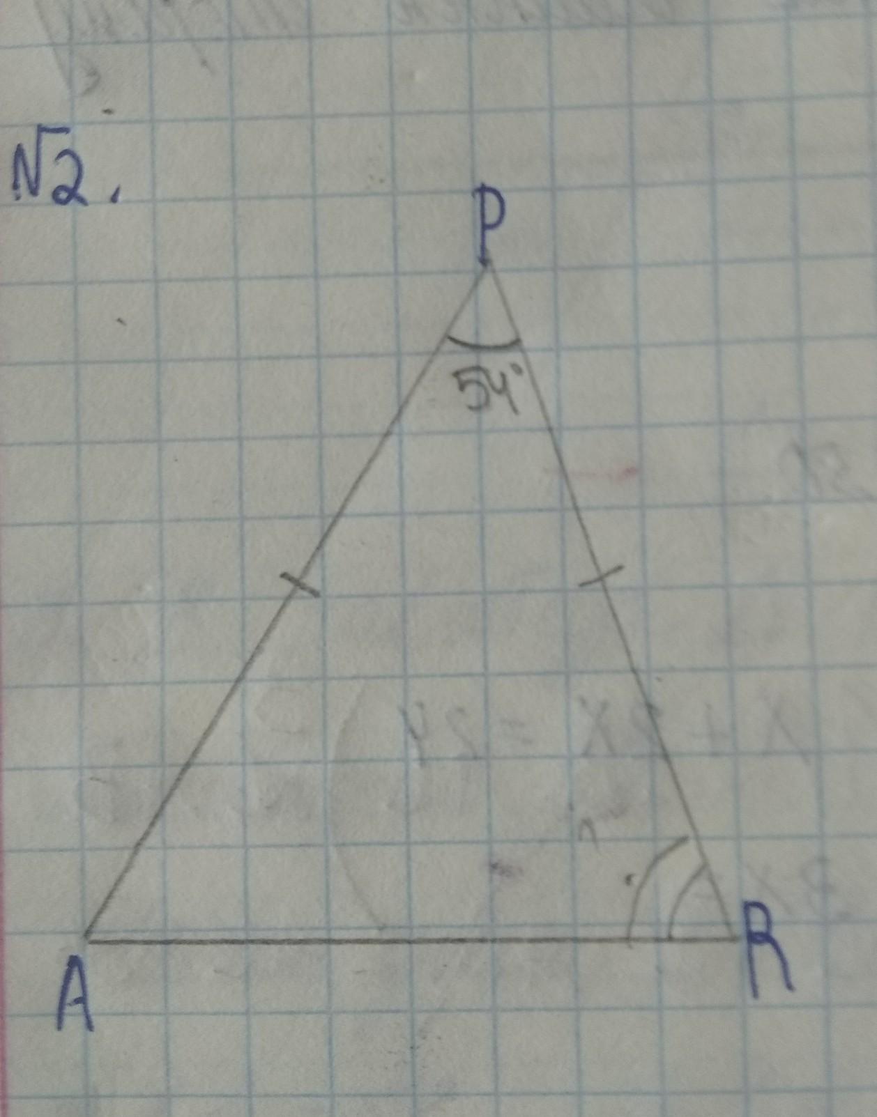 ∆APR равнобедренный, т.к. боковые стороны равны. Значит углы при основании равны. <A = <R = (180° - 54°)/2 = 63°.