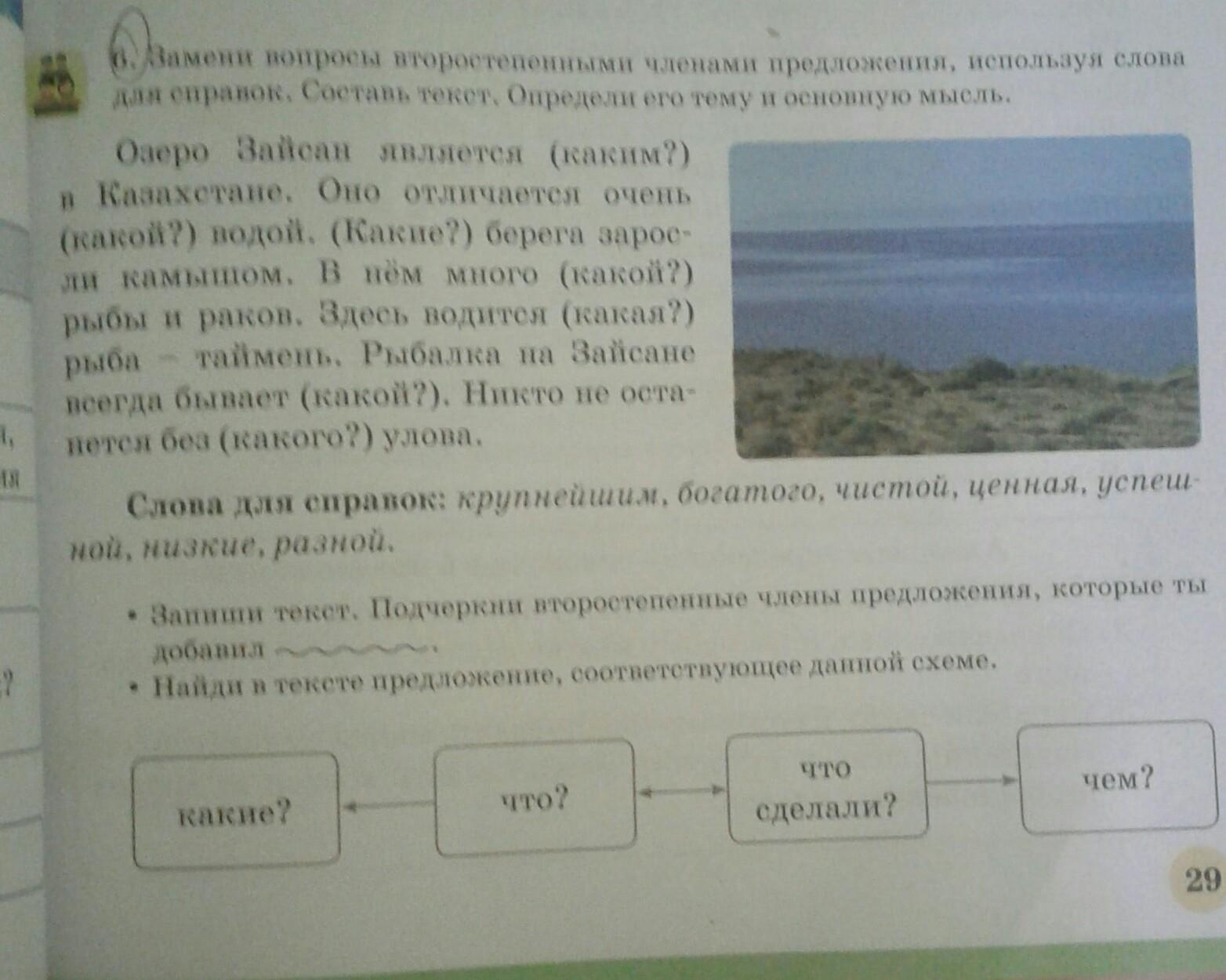 Озеро Зайсан является крупнейшим (определение, ~~~) в Казахстане. Оно отличается очень чистой водой (определение). Низкие(определение) берега заросли камышом.. В нем много разной(определение) рыбы и раков. Здесь водится ценная(определение) рыба- таймень. Рыбалка на Зайсане всегда бывает успешной(определение). Никто не остается без богатого(определение) улова.