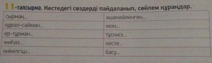 Объяснение:Ауылдағы әжем жаз айларында сырмақ сырады. Әкемнің құрал-саймандары өте көп. Ер-тұрмансыз атқа мінуге болмайды. Дүкендерде жиһаздардың түр-түрін көрдім. Киімдерді киімілгішке ілу қажет. Қазақтың сәукелесі әсем тастармен әшекейленген. Ағашты жону керек. Қабырғаға түскиізді жапсыру керек еді. Әпкем далада кестеге әдемі гүлдің суретін кестелеп отыр. Оның ашулы міңезін басу өте қиын.