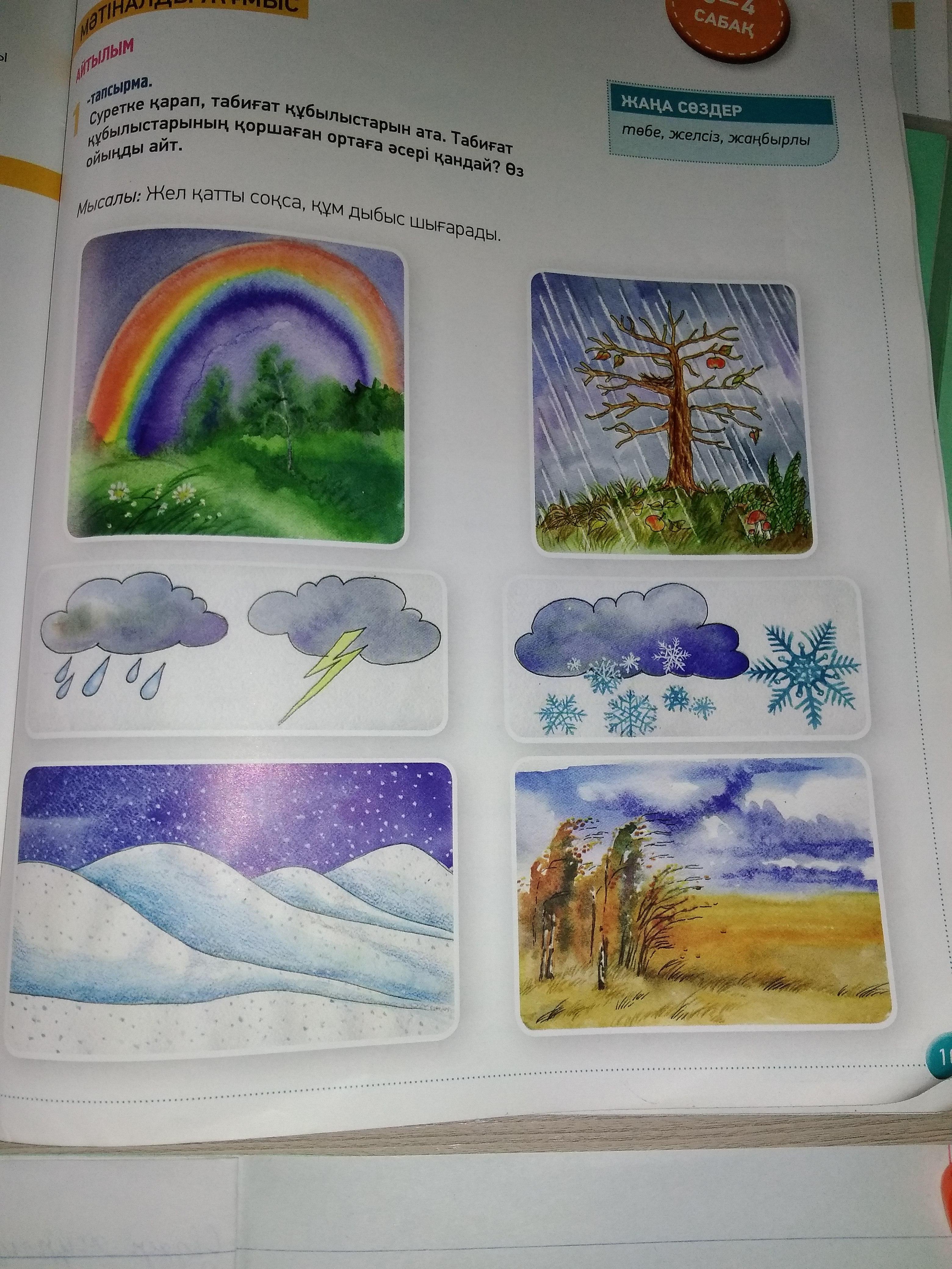 1.Суретте жаз мезгілі көрсетілген.Ағаш жапырақтары жаңбыр суымен жуылып жап-жасыл түрге еніп,ағашқа көрік беріп тұр.Көк шалғын жаңбырдан соң жуылып,самал желмен тербеледі.Ақ түсті гүлдер жаңбырдан соң бас көтеріп шалғынға сән беріп тұр.Жаңбыр басылып,көк аспанға әр түрлі рең беріп кемпірқосақ шықты.Жаңбырдан соң ауа тазарып,саф ауамен терең тыныстайсың.Жауған жаңбыр,кемпірқосақ табиғатқа әсем көрік беріп тұр.Жауған жаңбырдың әсерінен жерге көк көп шығады,малға тартырмас азық.