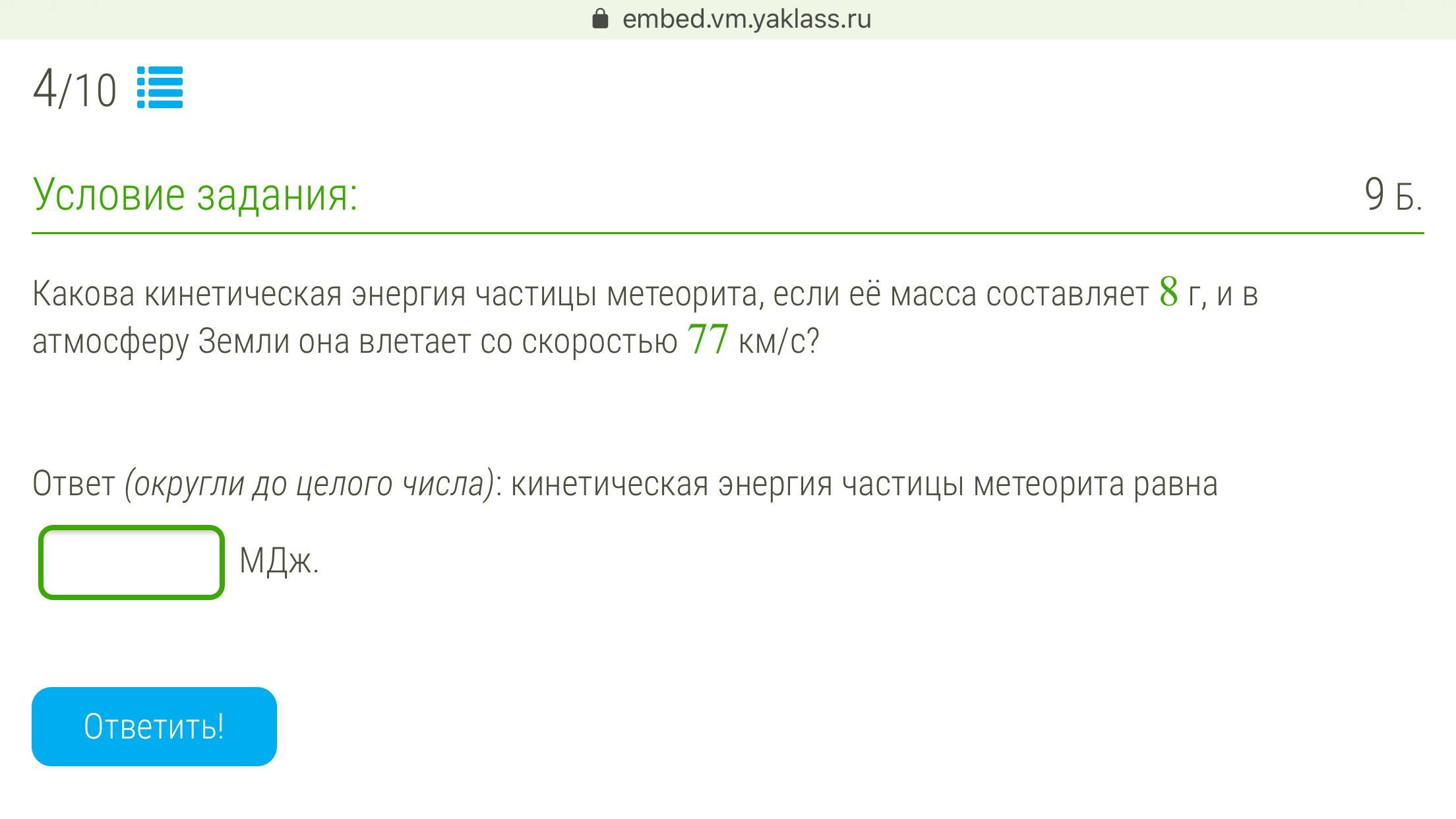 1. m=8г=0.008кг, v=77км/с=77*10³м/с, Ек=mv²/2≈24 МДж