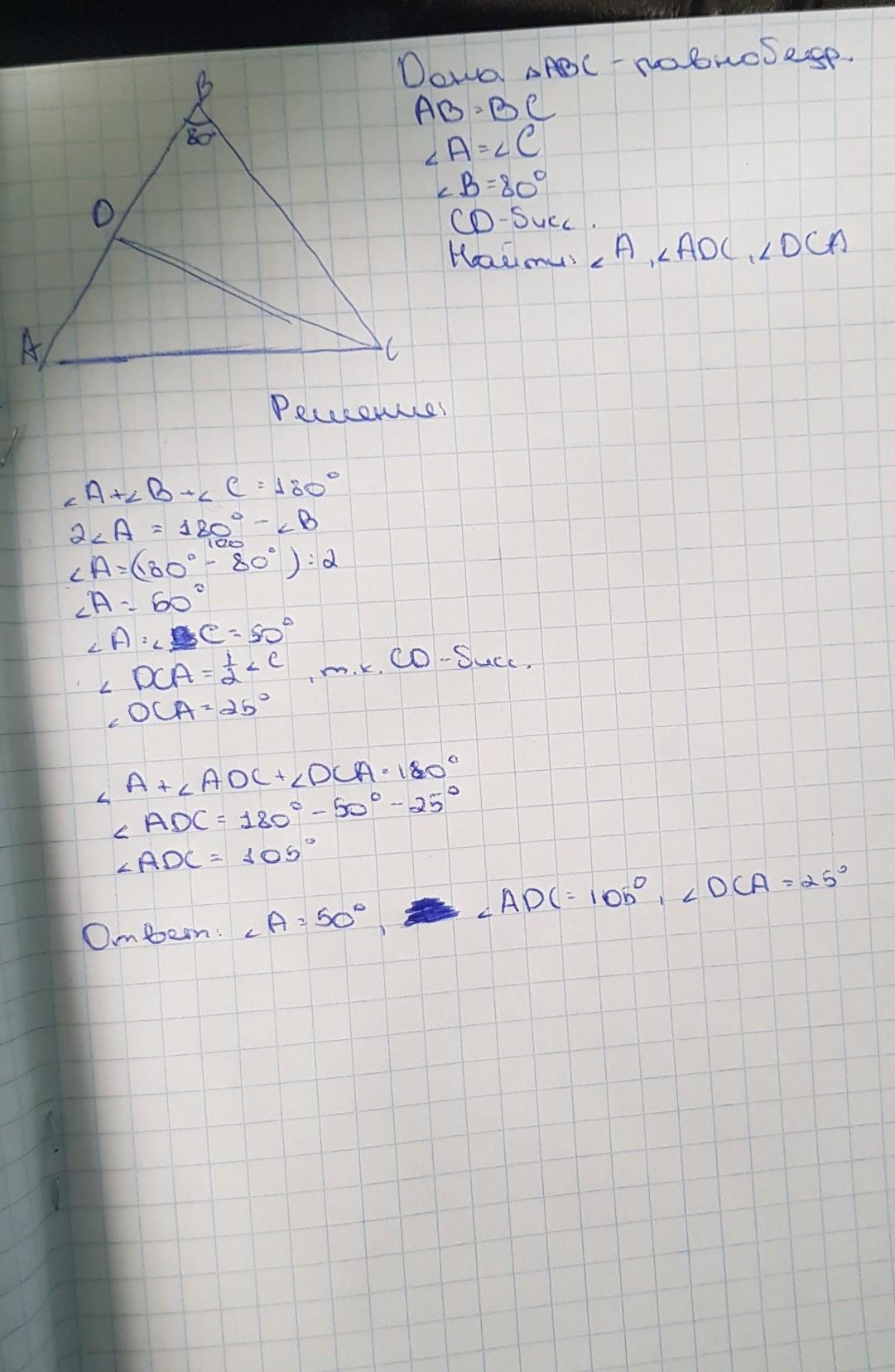 В равнобедренном треугольнике ABC с основанием AC проведена биссектриса CD. Найти углы треугольника ADC, если угол ABC=80 градусов.