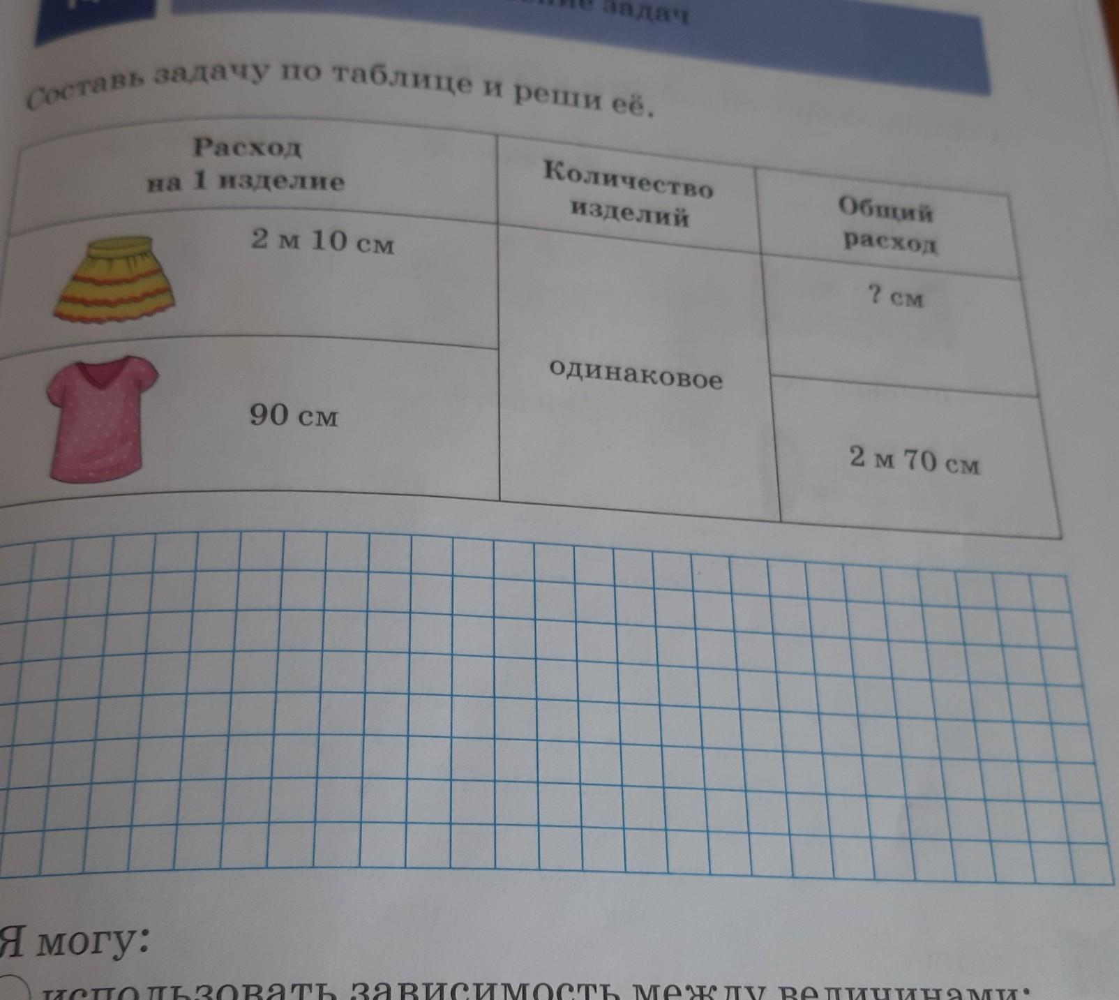 Сама задача: Швея на 1 юбку тратит 2м10см ткани ,общий расход на все юбки, что она сделала?см, а на 1 футболку 90см ткани и общий расход которой 2м 70см. Количество изделий одинаковое. Какой общий расход на юбки был у швеи?