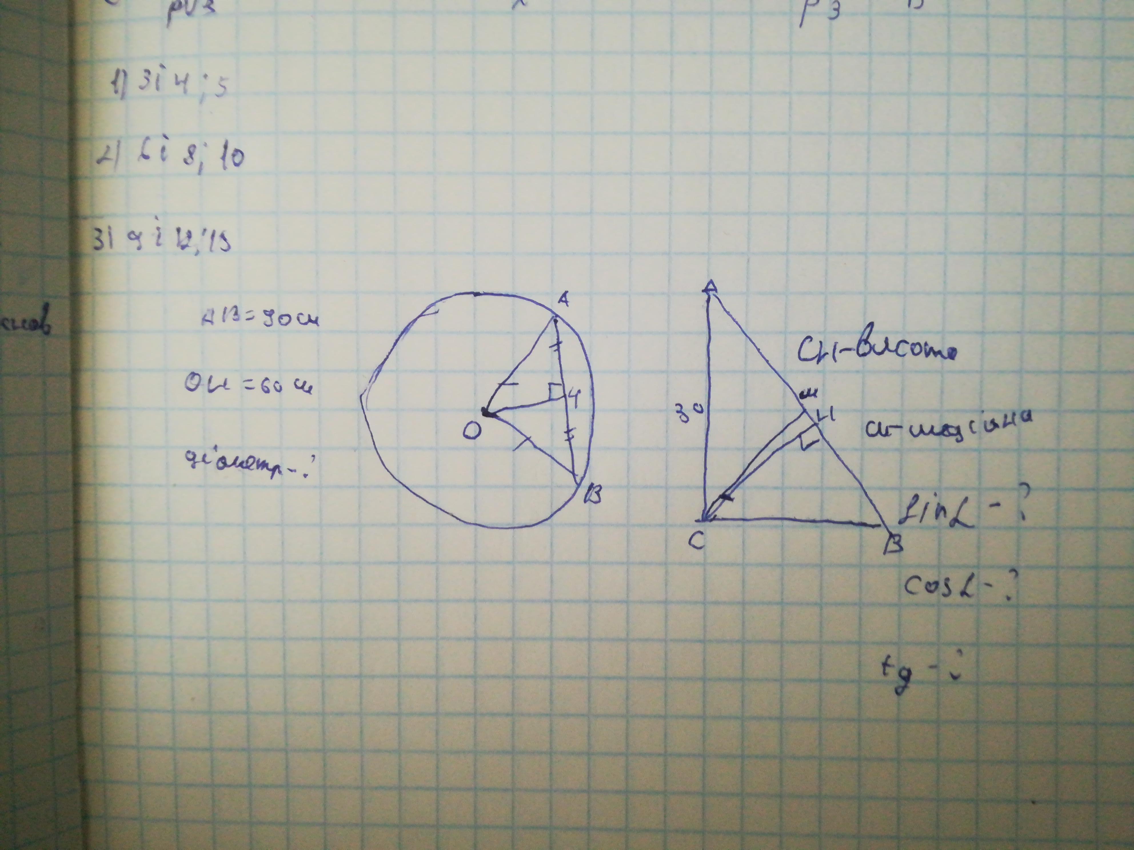 Диаметр равен двум радиусам, а так же гипотенузе треугольника AOB