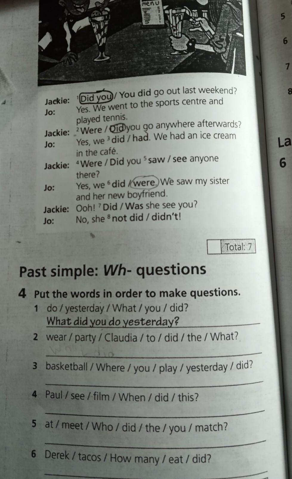 Ответ: 3. 1.Did you2.did you.3.did you see4.we did5.did she see you6.she didnt