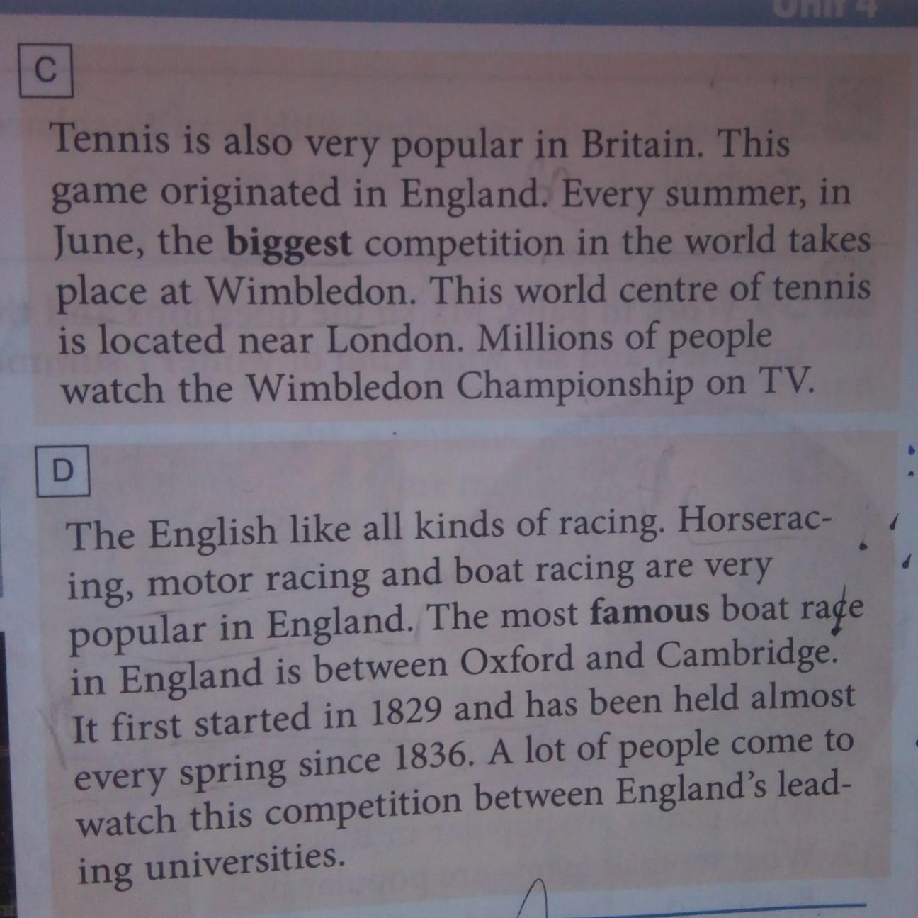 Теннис также очень популярен в Великобритании. Эта игра возникла в Англии. Каждое лето, в июне, на Уимблдоне проходит самое большое соревнование в мире. Этот мировой центр тенниса находится недалеко от Лондона. Миллионы людей смотрят чемпионат Уимблдона по телевизору