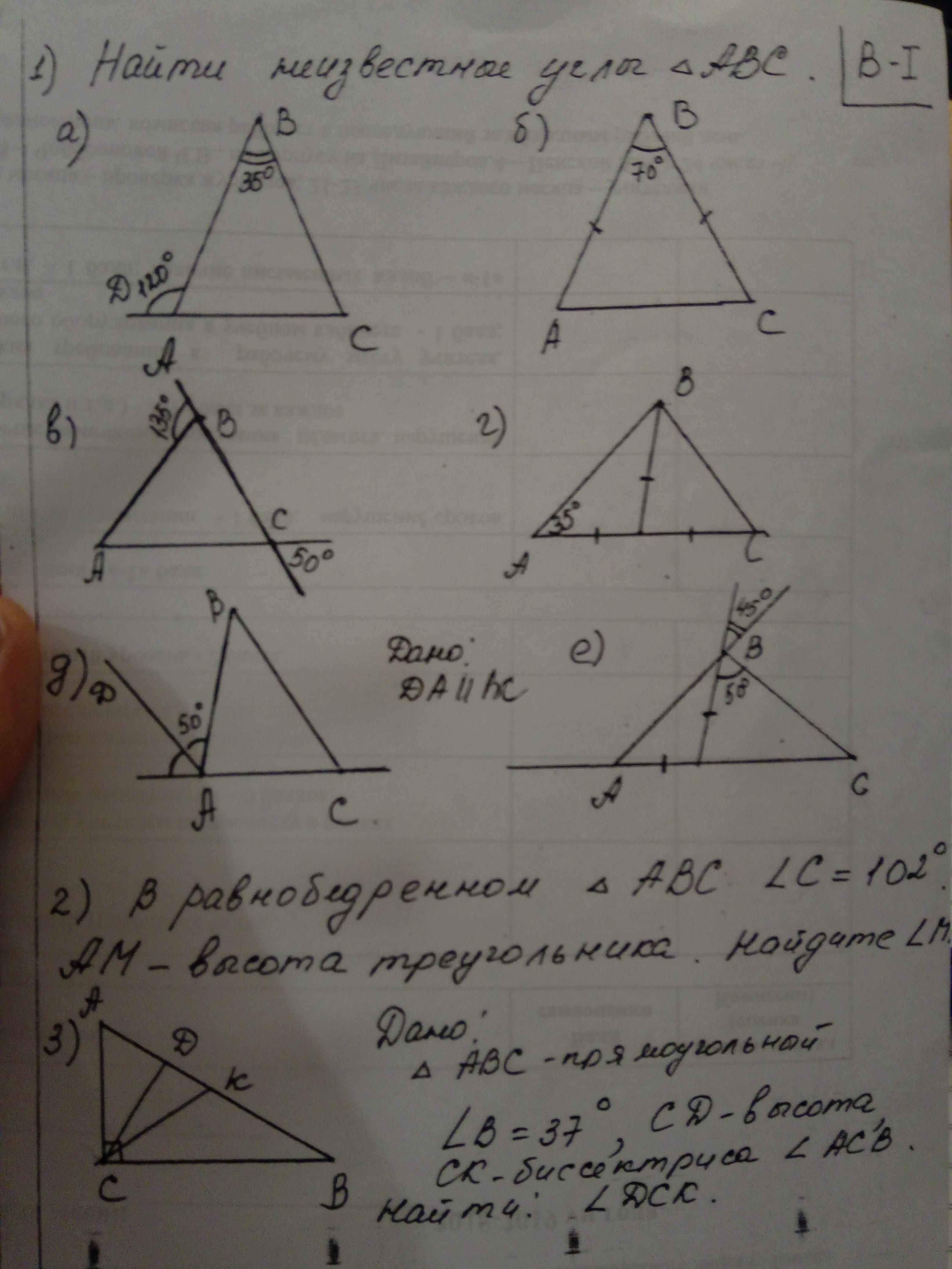 д)А=80° В=50° С=50°