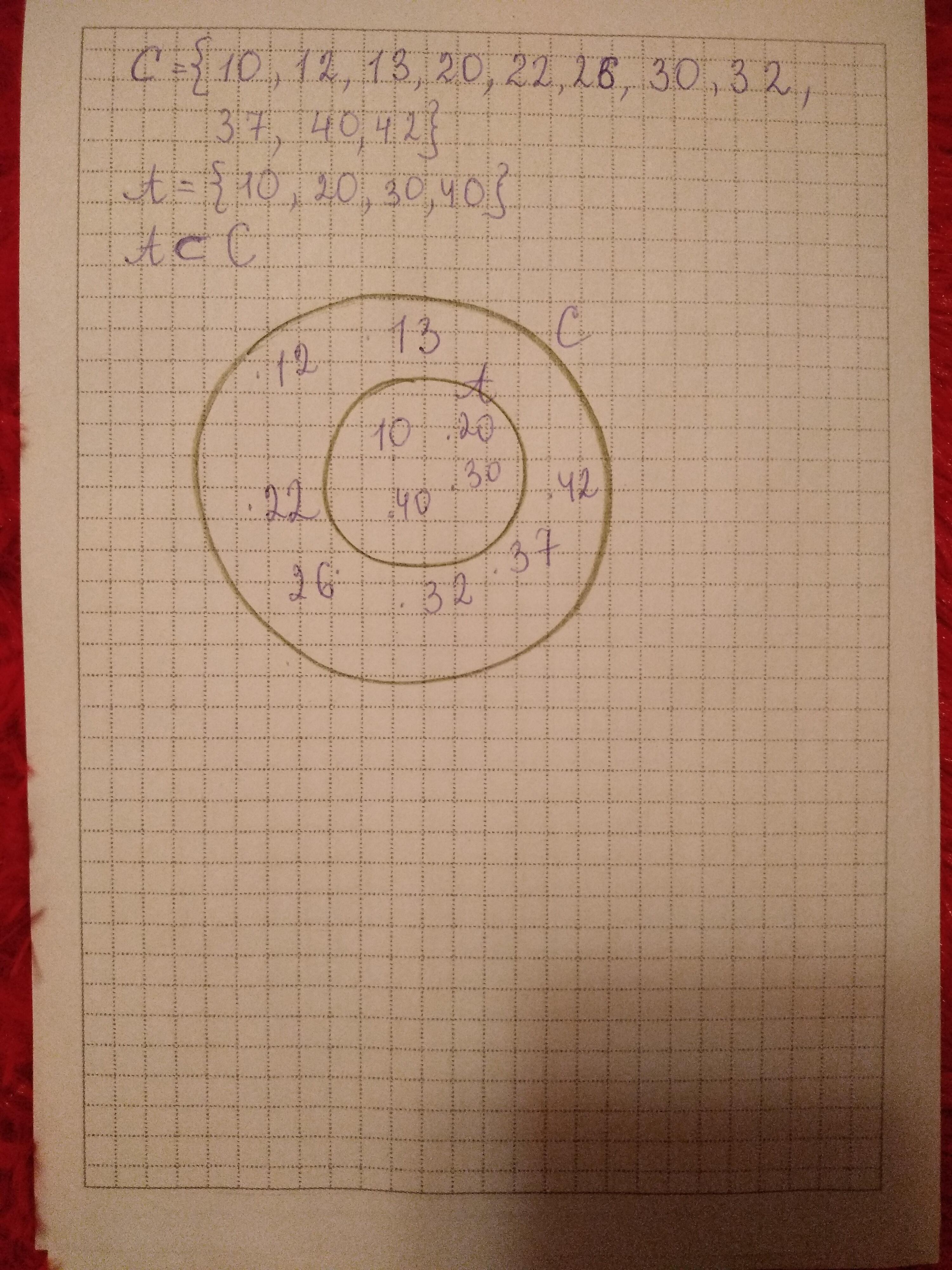 Дано множество С={10,12,13,20,22,26,30,32,37,40,42}. Составь одно подмножество данного множества чисел по самостоятельно установленному признаку. Изобрази при помощи диаграммы Эйлера-Венна, запиши элементы множеств в диаграмму.