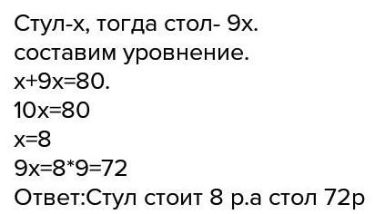 Решительно задачу: Стол в 9 раз дороже стула. Вместе они стоят 80 рублей. Сколько стоит стол и сколько стул?
