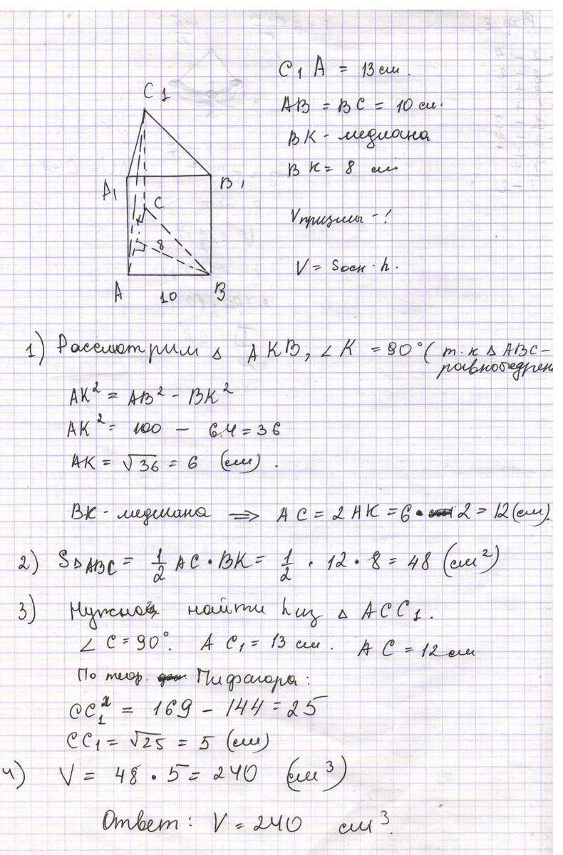 2. В основании прямой призмы лежит равнобедренный треугольник с высотой 4 см и боковой стороной 5 см. Найдите объем призмы, если диагональ наибольшей боковой грани равна 10 см.