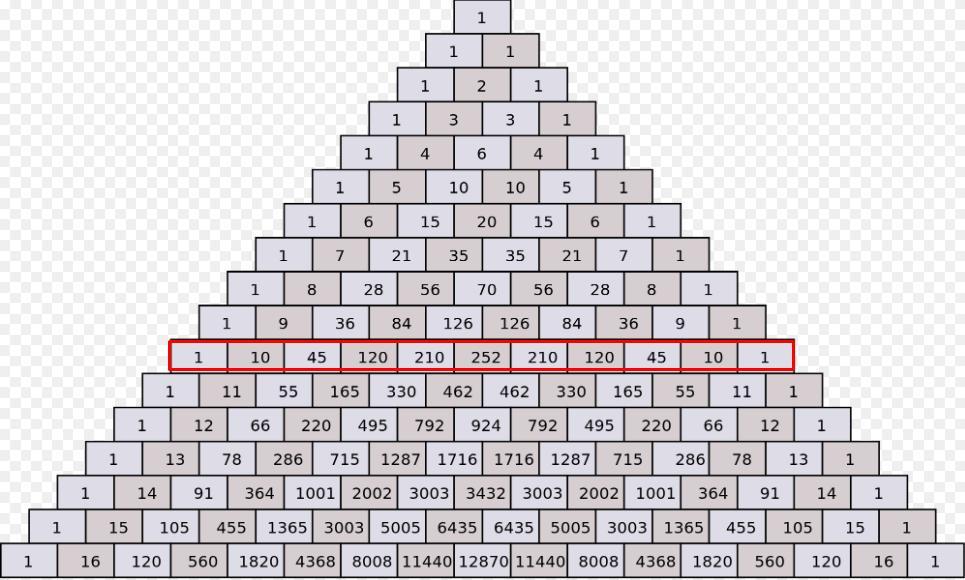В ответе использован треугольник Паскаля (он дан в приложении), будем использовать строку на 1 больше, чем данная нам степень (11-ая строка). И тогда получим, что: