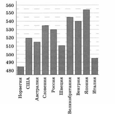 На диаграмме показан средний балл участников 10 стран в тестировании учащихся 8-го класса по естествознанию в 2007 году (по 1000-балльной шкале). По данным диаграммы найдите число стран, в которых средний балл отличается от среднего балла российских участников не меньше чем на 20 (саму Россию не считайте).
