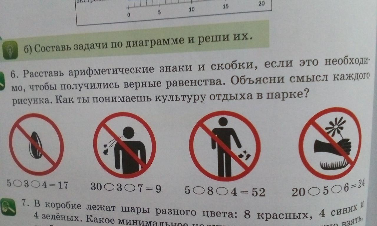 расставь арифметические знаки и скобки, если это необходимо, чтобы получились верные равенства. Обьясни смысл каждого рисунка. Как ты понимаешь культуру отдыха в парке?