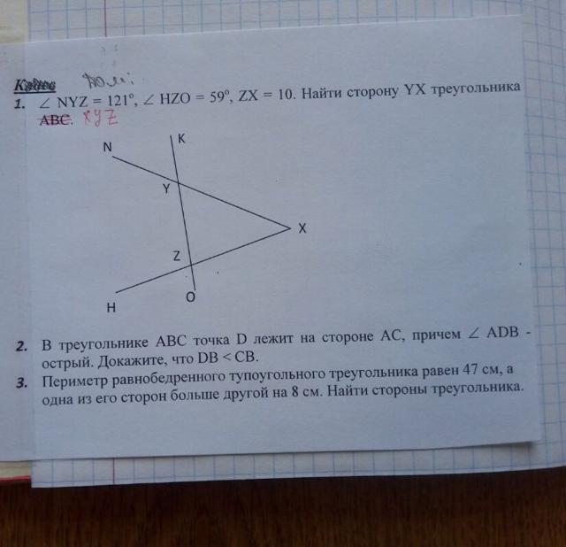 ∠YZX=∠HZO=59=∠ZYX=> Треугольник XYZ-равнобдеренный (XZ=XY)