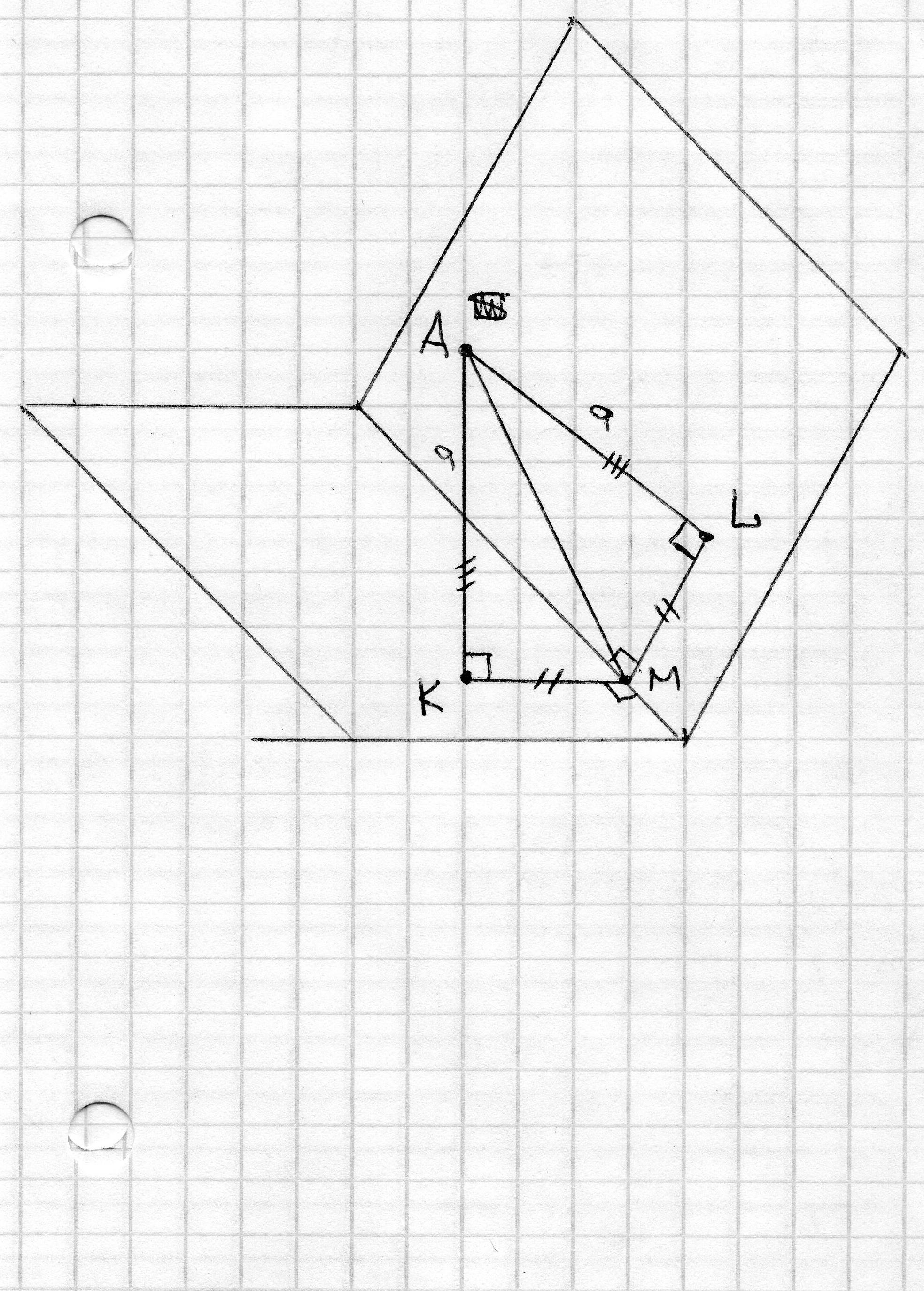 2. Получаем плоскость LAK, которая пересечет двухгранный угол по линиям KМ и LM, а ребро угла в точке M.
