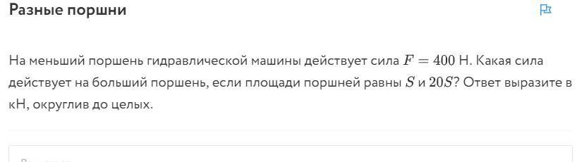 F2=F1*S2/S1=20*F1=20*400=8000 Н (8 кН)