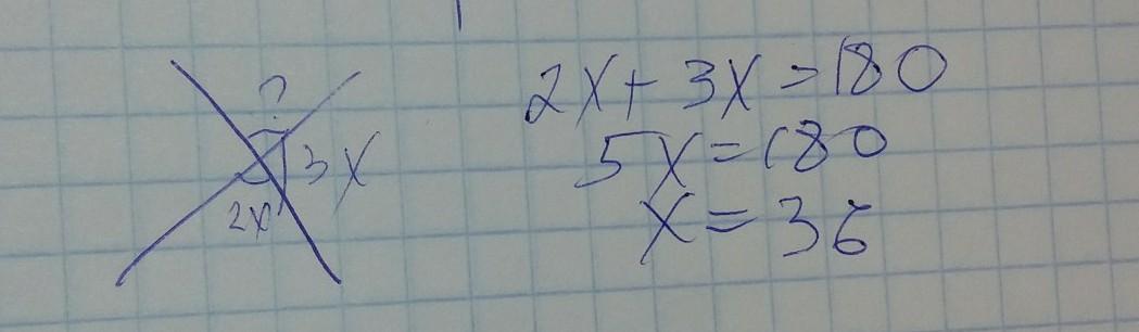 При пересечении двух прямых образовалось четыре угла меньше развёрнутого. Найдите меньший угол, зная, что градусные меры двух из них относятся как