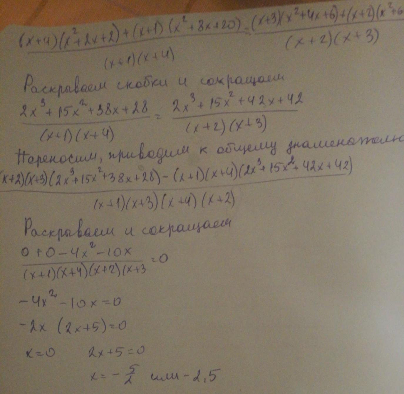 Даю много баллов. Пожалуйста с решением (x^2+2x+2)/(x+1)+(x^2+8x+20)/(x+4)=(x^2+4x+6)/(x+2)+(x^2+6x+12)/(x+3)