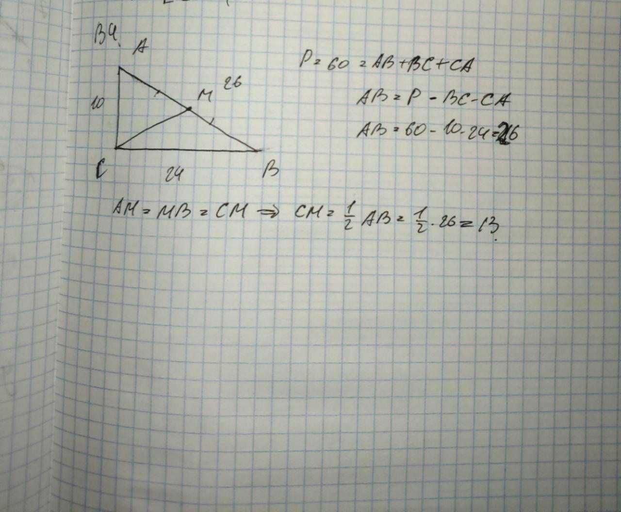 Периметр прямоугольного треугольника с катетами 10 см и 24 см равен 60 см . Найдите длину медианы, проведённой к гипотенузе.(номер В4)