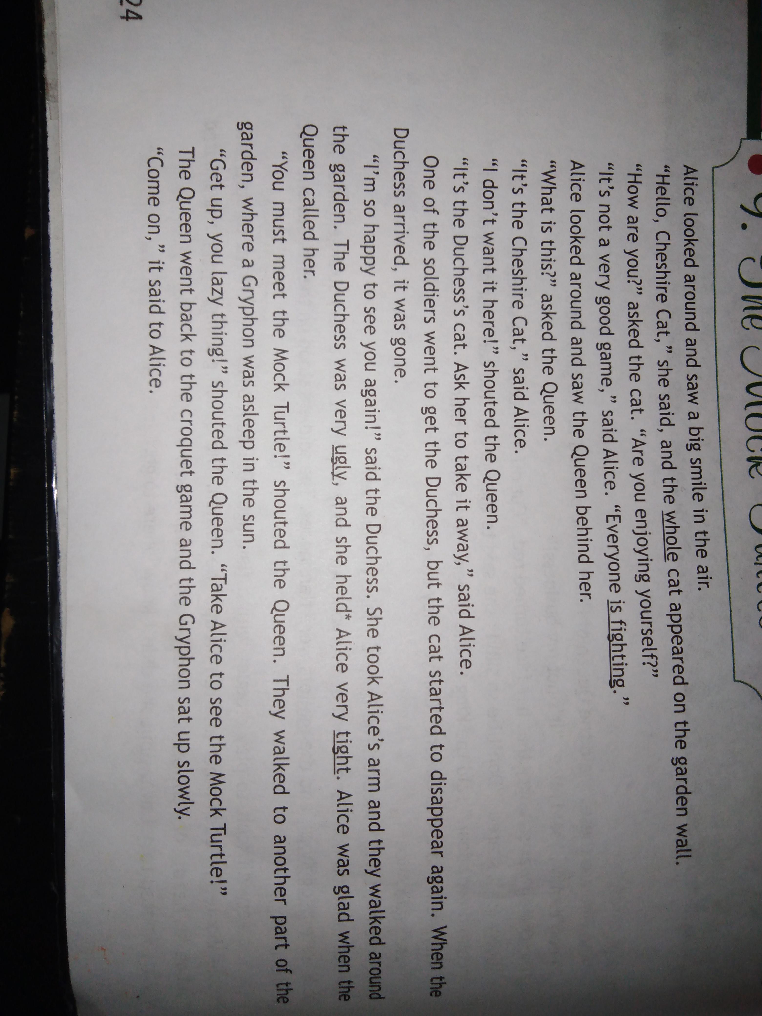 Алиса огляделась и увидела широкую улыбку в воздухе. «Привет, Чеширский кот», сказала она, и весь кот появился на стене сада. "Как твои дела?" спросил кот. "Ты наслаждаешься собой?" «Это не очень хорошая игра, - сказала Алиса. «Все борются». Алиса оглянулась и увидела королеву позади себя: «Что это?» спросила королева. «Это Чеширский кот», - сказала Алиса. "Я не хочу этого здесь!" крикнула королева. «Это кот герцогини. Попросите ее забрать ее», - сказала Алиса. Один из солдат пошел за герцогиней, но кот снова начал исчезать. Когда прибыли две герцогини, их не стало "Я так рад снова тебя видеть!" сказала герцогиня. Она взяла Алису за руку, и они обошли сад. Герцогиня была очень уродлива, и она крепко обнимала Алису. Алиса была рада, когда королева назвала ее "Ты должен встретить насмешливую черепаху!" крикнула королева. Они пошли в другую часть сада, где грифон спал на солнце. "Вставай, ленивая вещь!" крикнула королева. "Возьми Алису, чтобы увидеть ложную черепаху!" Королева вернулась к игре в крокет, и Грифон медленно сел: «Давай», - сказала она Алисе.