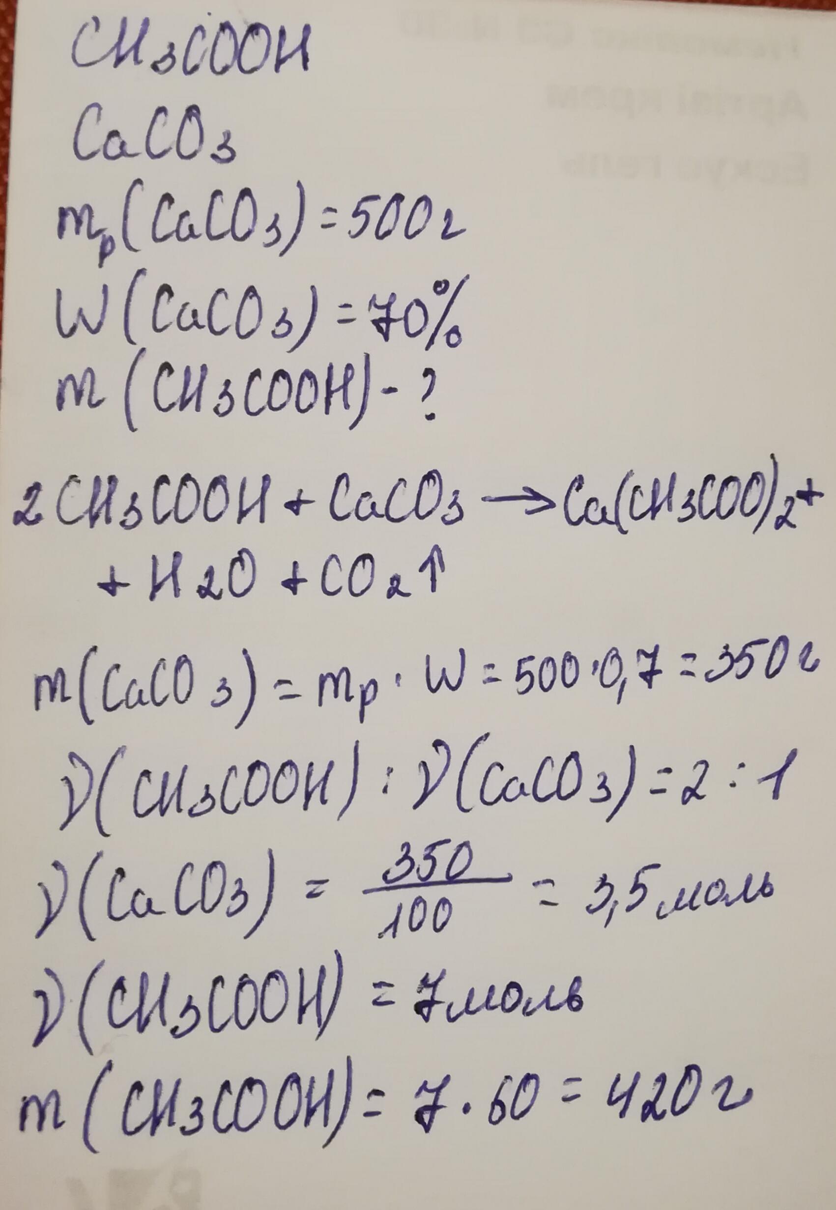 обчисліть масу етанової кислоти, що витрачається на взаємодію з вапняком масою 500 г, у якому масова частка кальцій карбонату становить 70%