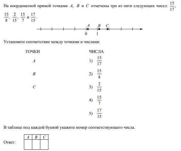 На координатной прямой точками A, B и C отмечены три из пяти следующих чисел: