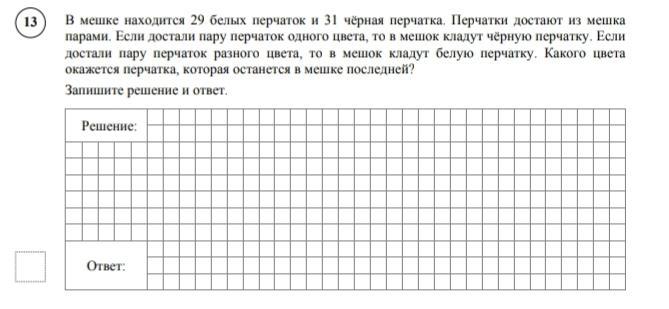 В мешке находится 29 белых перчаток и 31 черная перчатка. Перчатки достают из мешка парами. Если достали пару перчаток одного цвета, то в мешок кладут черную перчатку. Если достали пару перчаток разного цвета, то в мешок кладут белую перчатку. Какого цвета окажется перчата, которая останется в мешке последней?