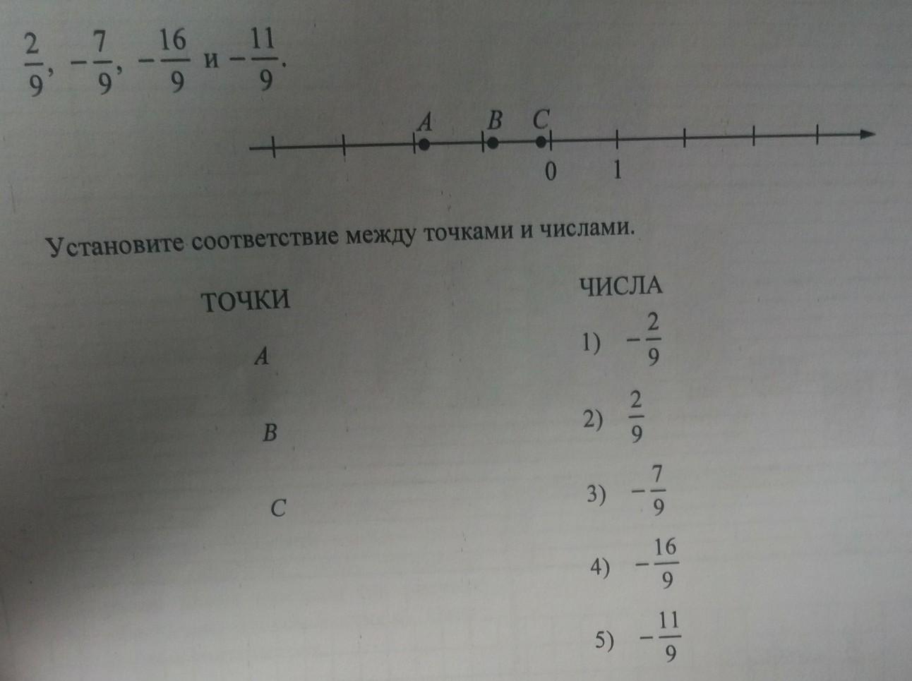 на кординатной прямой точками А В С отмечены три из пяти следующих чисел: -2/9; 2/9; -7/9; -16/9; -11/9