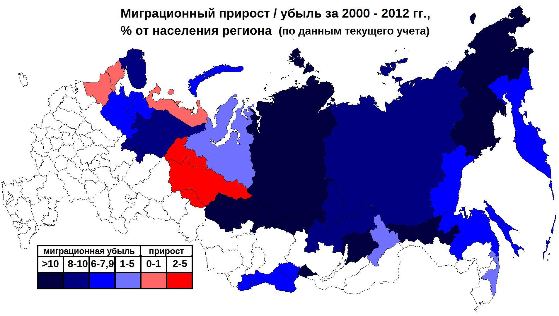 Если посмотреть на карту внутренней миграции страны, которая дана ниже в приложении, то можно на ней увидеть, что наибольшая миграционная убыль населения наблюдается в Чукотском АО, Магаданской области, республике Саха, Красноярском крае, Забайкальском крае.