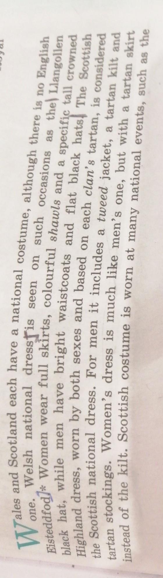 У Уэльса и Шотландии есть национальный костюм, хотя нет английского. Валлийский национальный костюм можно увидеть в таких случаях, как ежегодный лланголлен эистедфод. Женщины носят пышные юбки с пестрыми лифами, разноцветные шали и особую высокую коронованную черную шляпу, в то время как мужчины носят плотные талии и плоские черные шляпы. Шотландское нагорье, которое носят полуисексуалы и основывается на характерном тартане каждого клана, считается шотландским национальным платьем. Для мужчин это твидовый пиджак, тартановый килт и тартановые чулки. Женское платье похожее, но с юбкой из тартана вместо килта. Шотландский костюм носят на многих национальных мероприятиях, таких как