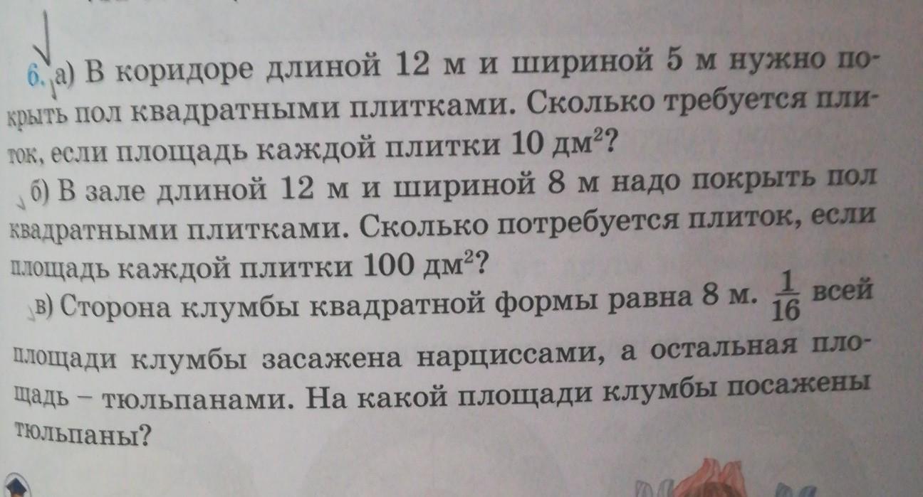 1) 12 м * 5 м = 60 м² = 6000 дм² площадь коридора
