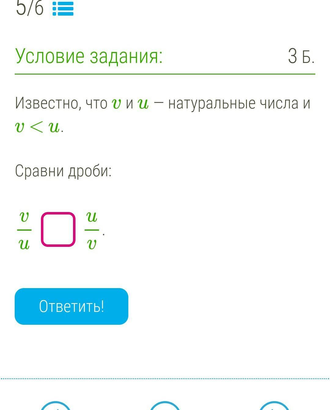 из условия следует v/u<1, u/v>1, v/u<1<u/v, v/u<u/v