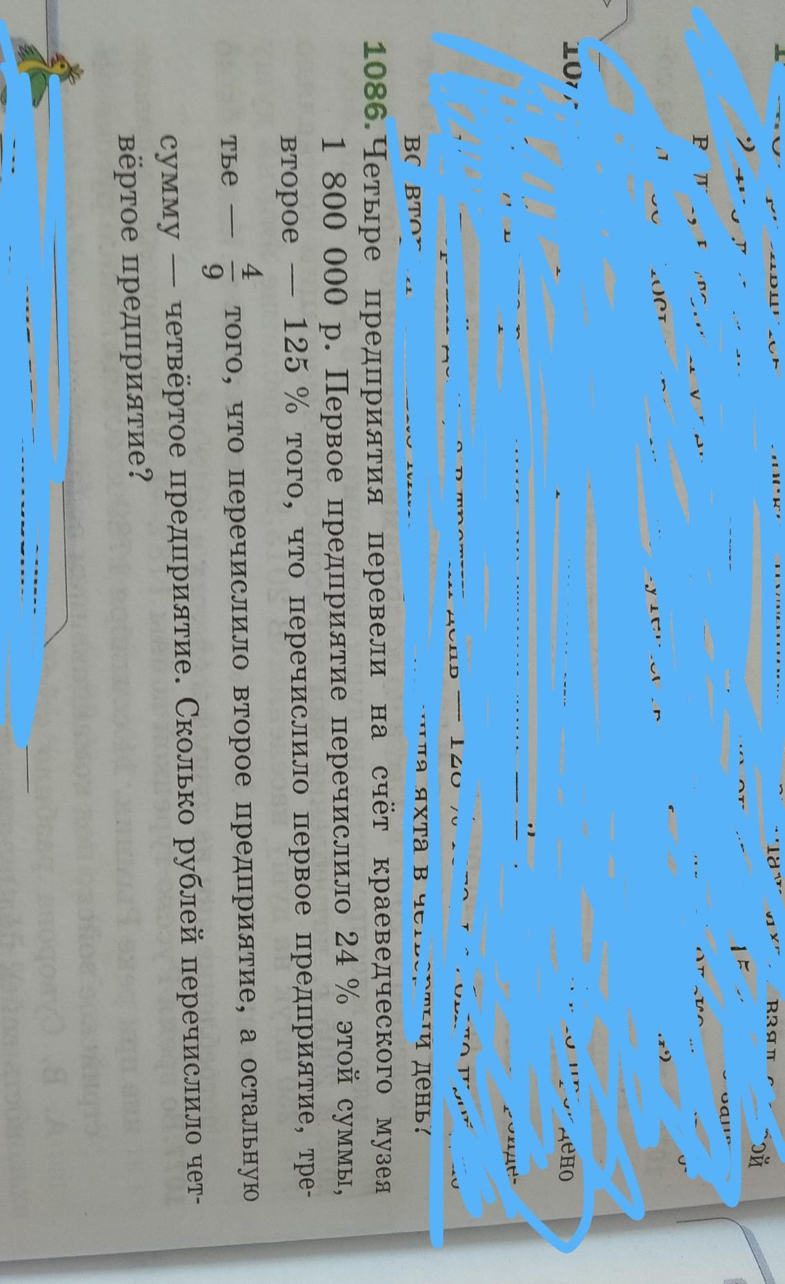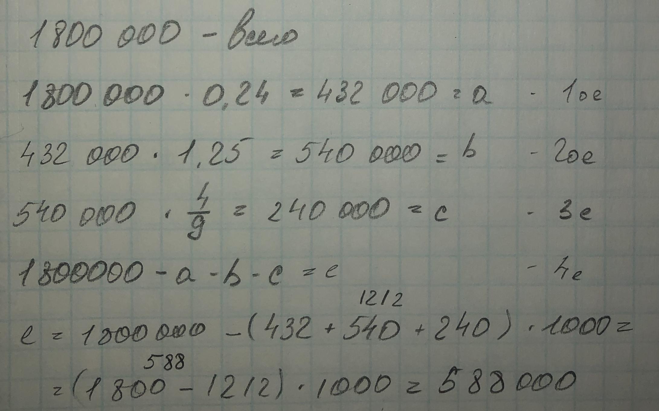 Высчитываем, сколько отдали первые три предприятия. Затем из всей суммы вычитаем суммы, перечисленные первыми тремя предприятиями. Получим сумму, которую отдало четвёртое предприятие