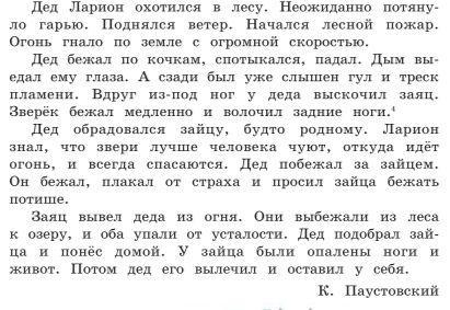 Заяц выбежал из огня, а за ним-дед. Выбежали они к озеру и от усталости оба упали. Дед взял зайца на руки и принёс домой. У зайца были опалены живот и задние лапы. Ларион вылечил зайца и оставил его у себя. Как ты просил(-а)